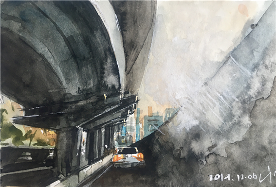 당분간 푸르고 붉음을 피하여 무채색이 흗뿌려진 거리에 몰두할까 보다. 지난가을 나는 색체의 화려함에 소름이 돋았고 선명의 희열에 몸을 떨어야 하는 사치를 누렸다. 하지만 그들을 보내고도 허전해하지 않아야 할 것. 밝음과 선명의 허기는 밀도로 채워야 할까 보다. 그리하여 나는 이 그림의 제목을 ‘빛의 밀도’라 이름 지었다. 물감이 더해지고 종이가 두터워졌다. 오호라. 그림을 그린다는 것은 삶의 과정을 칠하는 것인가 보다. 어디 나뿐일까? 겨울이 오면 허기진 속내에 붓질이 애절하다. 아~ 두터워져야 마음이 놓이는 계절, 겨울이 온 것이다.
