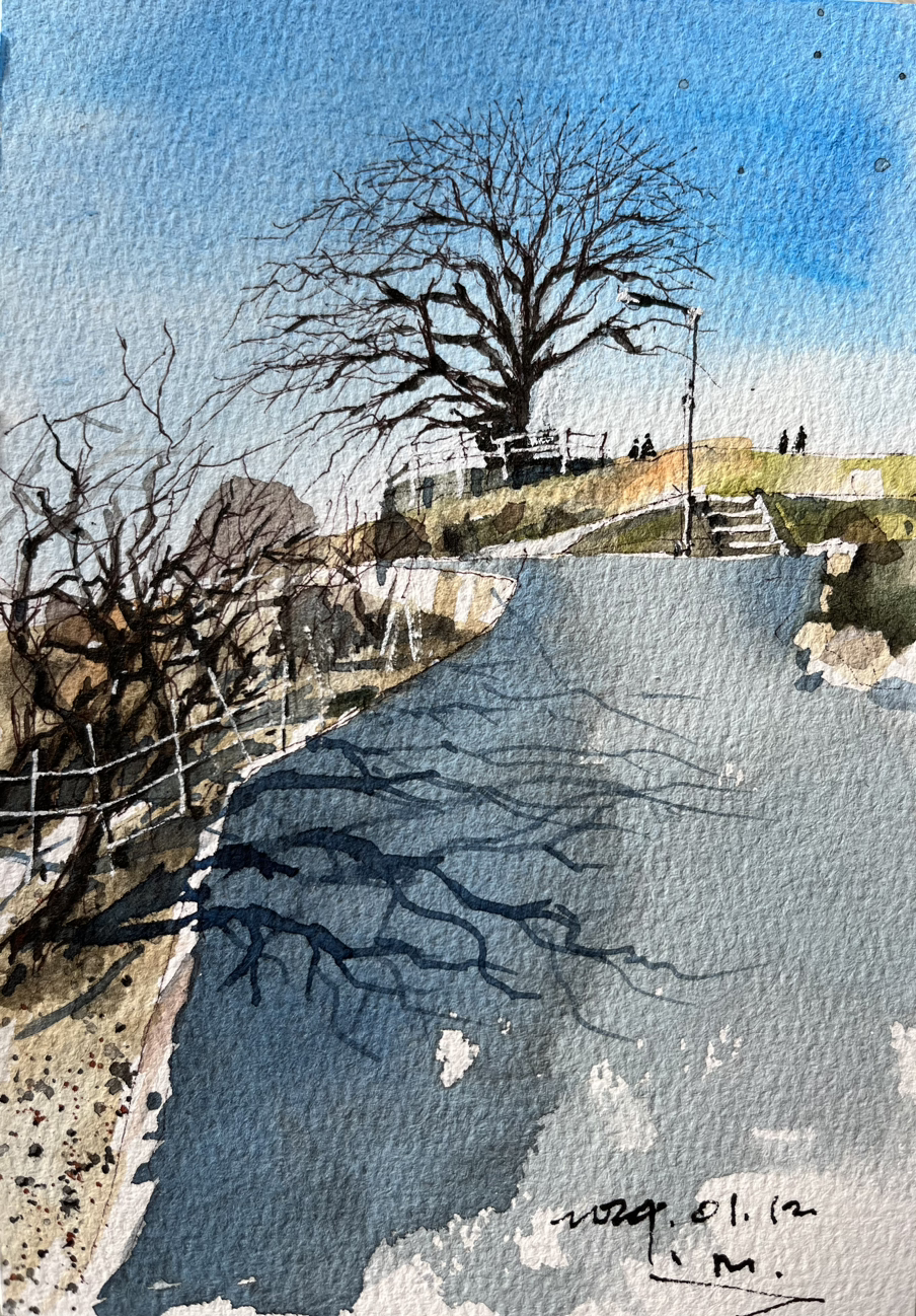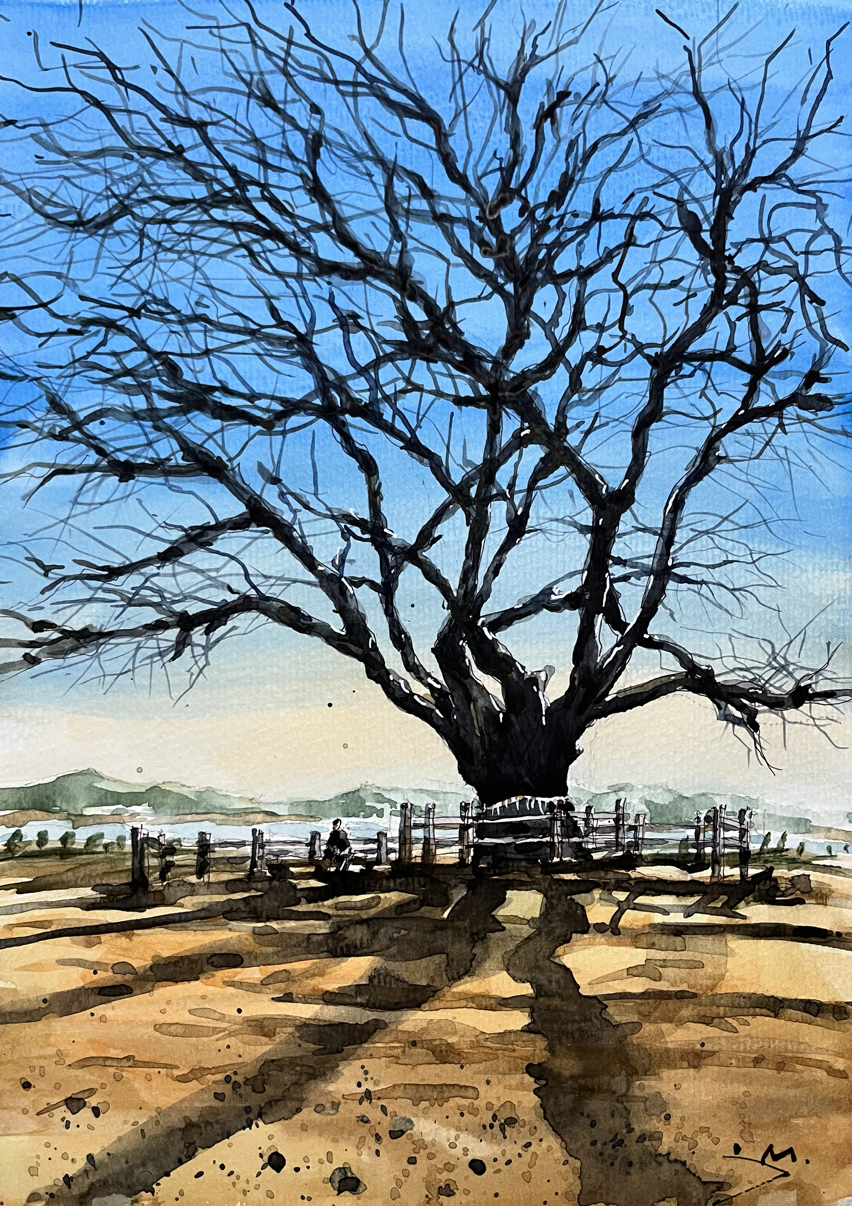누군가 내게 나무는 겨울에 그리라고 말했다. 그 말은 옳다. 섬세, 강건, 의지, 심지어 균형. 여름에 몰랐던 것을 이제 알겠다. 잎을 떨구고 입을 다문 큰 나무 아래에서, 오히려 나는 옷깃을 여미고 그저 바라보기만 한다.