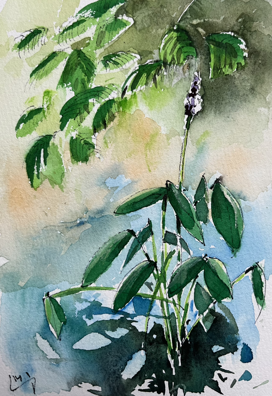 그 아래에 핀 물칸나의 보라색 꽃에 끌리어 연못 가까이로 간다. 그러고 보니 물에서 피는 꽃에 보라색이 많다. 빨간색에 물을 타면 보라색으로 변하는 걸까? 잉크를 쓰던 시절의 어느 비 오는 날, 책갈피에 번졌던 푸른 잉크의 색을 떠올렸다.