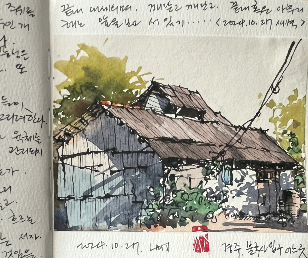 불국사 입구에서 하룻밤 묵고, 일찍 깨어 주위를 산책하는데. 폐역사 옆에 묶인 개 한 마리, 저리도 짖어 댄다. 사람 걸음이 뜸하다는 이야기가 아닌가? 인적이 드무니 개의 짖음은 더욱더 크다. 한때, 풍성을 이루던 거리는 오래된 사람들의 기억에만 머물렀고, 또 새로운 세상을 향해 발버둥인양.