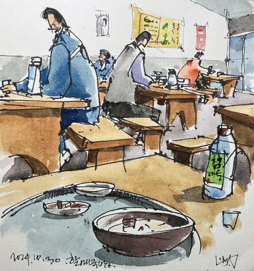 저마다 소주 한 병에 국밥 한 그릇을 안고, 등을 돌려 앉은 할매국밥집. 오늘 따라 할매마저 입을 다문 채, 방송국 아나운서 소리만 휑한 공간을 떠돈다. 간간히 소줏잔이 탁자와 부딪히는 소리에 무심코 고개를 들어 보지만, 다시 고개를 떨구는 모두. 빈잔을 다시 채운다. 술병이 반쯤 비었다는 것은, 귀가의 순간이 가까워진 것이 아니다. 모두 시간이 정지된 세상을 갈망하는 것은 아닌지? 시간, 어쩌면 그것이 이 우울의 단초였을지 모른다. 그리하여 시간이 정지된 듯한 이 오래된 식당에 서로 등 돌리고 앉았을 지도 모른다.