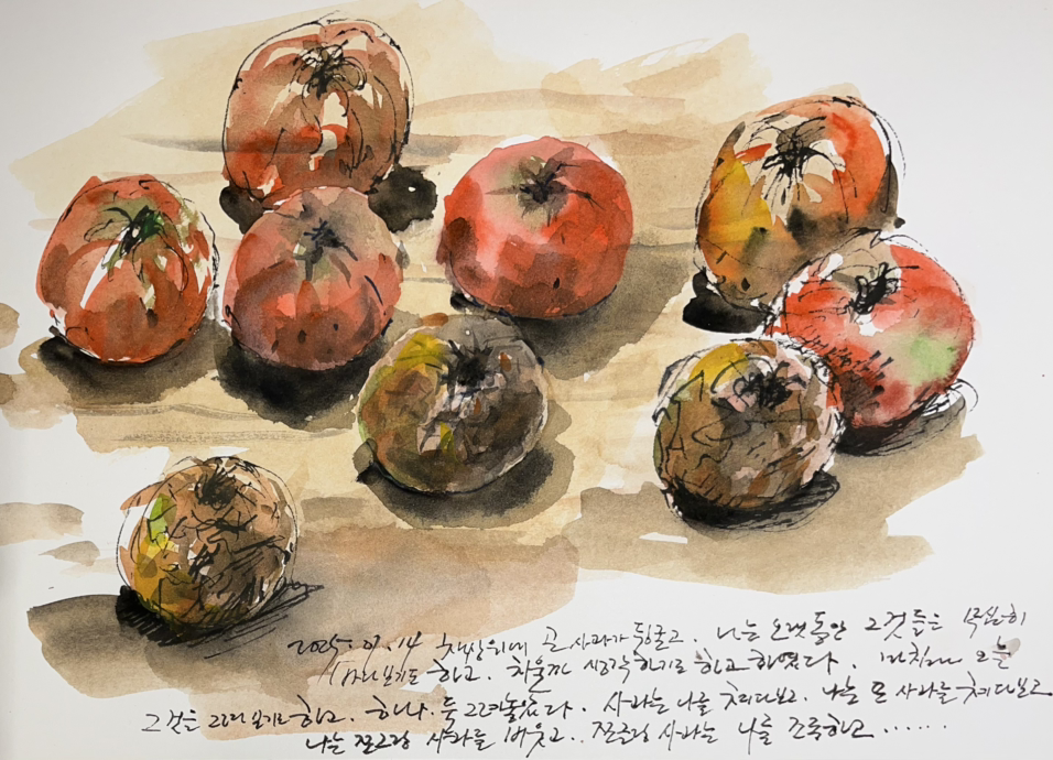 책상 위에 곤 사과 뒹굴었는데, 나는 오래도록 그것들을 무심히 쳐다보기도 하고, 치워버릴까 생각하기도 하였다. 마침내 오늘, 그것을 그려 보기로 하고. 하나 둘…아홉까지 그렸다. 푸른기가 조금 남은 것, 검불그래 한 것, 흉칙하게도 흑갈색으로 변해 버린 것. 나는 그것들을 유심히 쳐다 보는데, 사과 또한 빤히 나를 쳐다보고 있다. 내가 쪼그랑 사과를 비웃는지? 아니면 곤 사과가 나를 조롱하는지? 처지가 비슷한 것들끼리 잘 놀고 있구나.