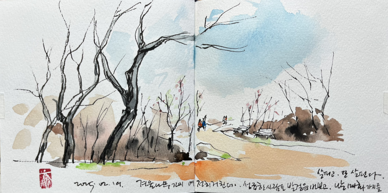 겨울나무 등걸 여전히 거친데, 성급한 사람들 발걸음 바쁘다. 연두를 품은 하늘빛, 나는 매화나무 가지를 살피고 또 살핀다.