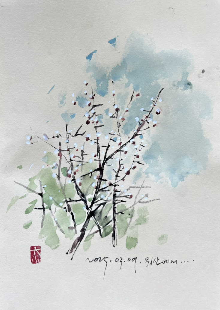 매화 봉우리 드디어 하늘에 걸렸다. 웅크렸던 내 가슴도 꽃 따라 파란 하늘로 올라가네.