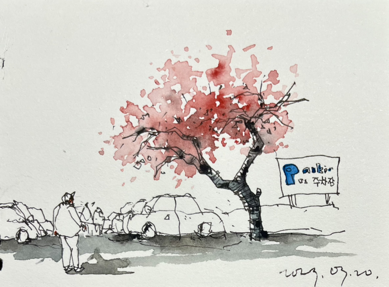 겨우내 몰랐네. 오래된 나무 한 그루 있었다는 것을. 하염없이 쳐다본다 저 꽃. 부라보 부라보! 연분홍 열정.