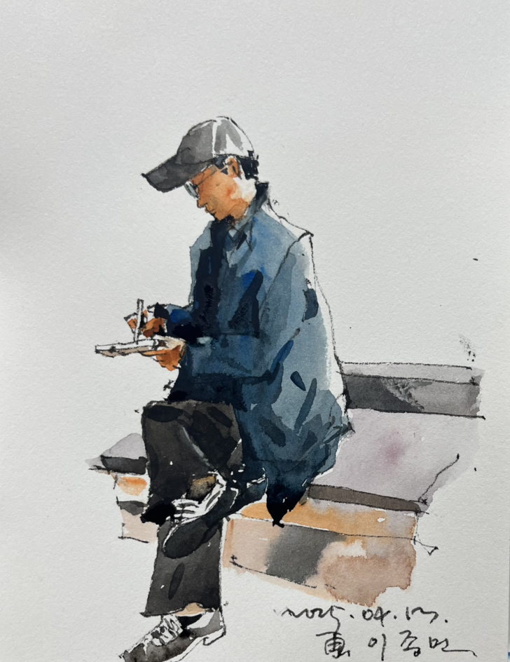 허구헌날 그림만 그린다고 핀잔이 잦았는데, 요즈음은 곧잘 그림 그리는 모습을 찍어준다. 나는 그것을 또 그림으로 그려 보는데. 아뿔사! 처지를 잊어버리고 자꾸 젊은이의 모습으로 그리려 하네.
