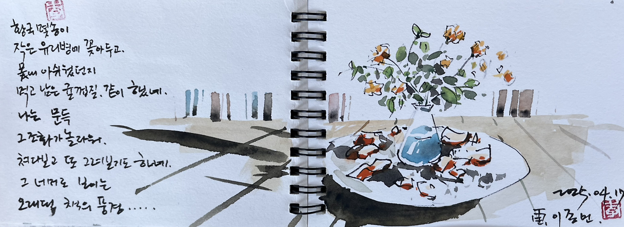 황매화 몇 송이 작은 유리병에 꽂아두고. 못내 아쉬워 남은 귤껍질 함께 두었네. 나는 문득 그 조화가 놀라워. 쳐다보고 또 그려보기도 하였네…… 지긋이 감은 눈. 그 너머로 보이는 오래된 책의 풍경.