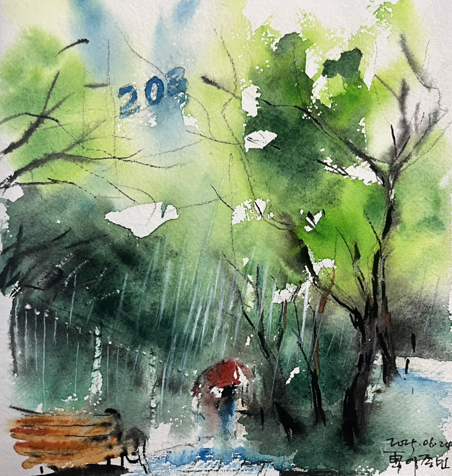 다시 말하지만, 당분간 이런 풍경이 계속 되지 싶다. 위를 향해 고개를 들 엄두는 커녕, 10 미터 앞도 가물가물. 어쩔 수 없는 일이다. 살면서 이런 날이 어디 하루 이틀이었을까? 돌이켜 보니. 그때마다 오히려 보이지 않는 것들을 찾으려 애썼다. 물을 그린다. 흥건한 물 속에 뚝뚝 떨어지는 색. 그 위로 다시 떨어지는 비. 당분간 장마.