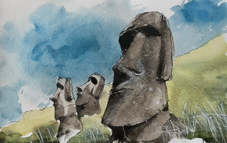 이스트섬에 있는 모아이 거대 석상들은 모두 한 방향을 보고 있다. 크기는 물론이려니와 얼굴의 형태와 고개 숙인 각도와 방향이 이루는 선형이 무척 예술적이다. 그럼에도 내 눈에는 슬픈 군상이다. 마치 시인 유치환이 쓴 ‘저 먼 해원을 향하여 흔드는 노스탈지아의 손수건’에서의 느낌처럼. 전설에 의하면 이 군상들은 우주의 어느 별에서 온 외계인의 변신이며, 모두 그 별을 쳐다보고 있다고 전한다. 나는 전설을 믿었다. 적어도 내가 그림을 그리고 있는 작은 시간 만큼은.
