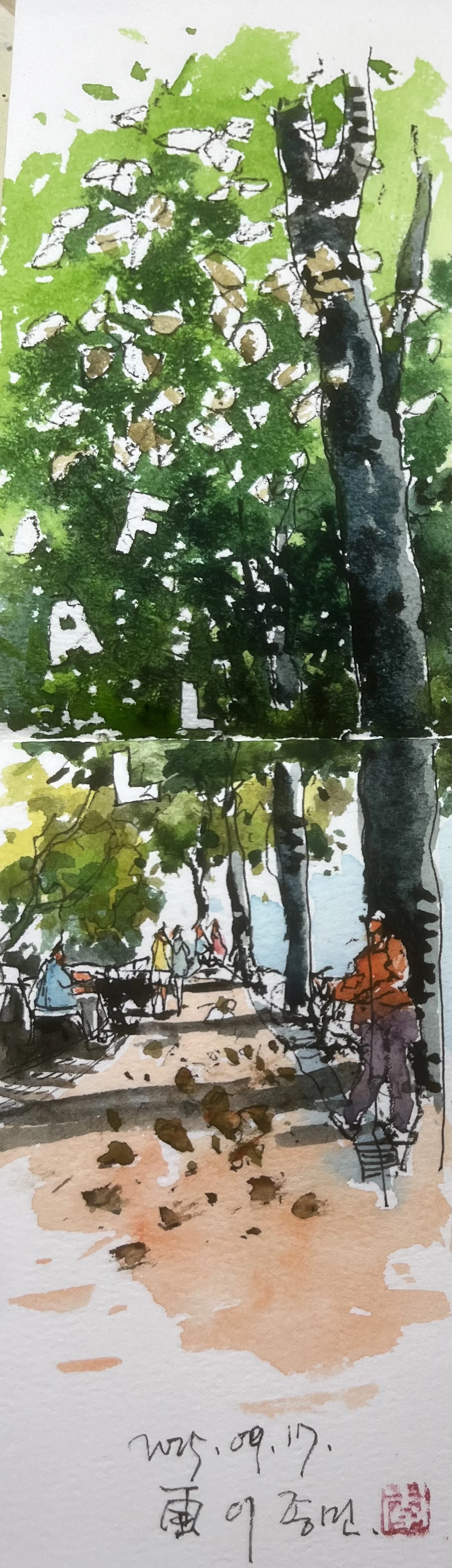 나뭇잎이 떨어지기 시작했다. 낙엽이 많은 북미, 캐나다에서 주로 쓴다는 말 Fall(가을)의 어원이 ‘떨어진다.‘에 있음을 실감한다. 사각사각 밟히는 거무데데한 이파리를 지나면서 공연히 고개를 들어 위를 보니, 하르르 내 얼굴로 떨어지는 이파리 몇 개. 아~ 나무는 결국 저 많은 잎을 다 떨구어 버리고 말겠지? 모든 마지막이 그러한데, 느티나무와 벚나무의 계절맞이는 더욱 처연하다. 빨갛고 노랗게 마지막을 불태우지도 못하고 물러나는 나무의 모습. 나는 좀체 고개를 내리지 못한다. 문득 연두빛 새순과 눈보다 하늘을 다 덮었던 꽃의 시절과 거침이 없었던 진초록이 도발하던 시간을 생각했던 것이다. / 해운대 좌동 PM 3:00