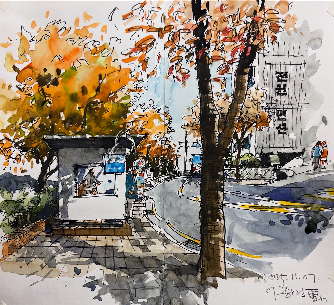 “아무 일도 안 일어나고 아무도 안 오고. 아무도 안 떠나고 참 지겹군” ‘고도를 기다리며’에 나오는 이런 대사를 떠올린 건. 정류장 유리 너머의 사람이 꽤 오래도록 앉아 있었음을 알아챈 후. 정류장 위의 나뭇잎 색이 날이 갈수록 짙어지고, 바람 소리는 커지네. 내 그림 속 오후 햇살이 유리창 속 노인의 등허리처럼 굽었다. / PM. 3:00 산복도로