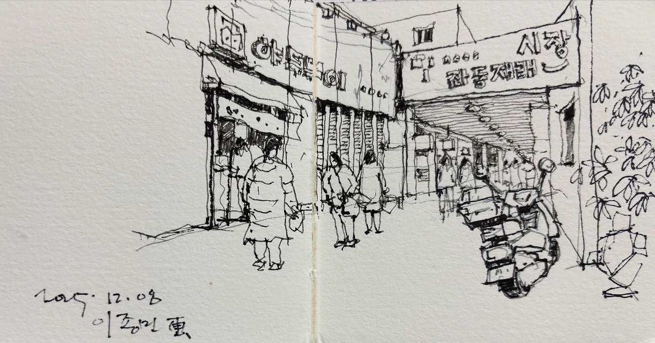 좌판에 앉은 할머니 어깨가 유달리 움츠러 들고. 칼국수집 의자에도 사람이 드문드문. 몇 안 되는 푸성귀 마다 생기를 잃고, 좌판에 누운 생선의 눈망울은 왜 이다지 흐리멍텅한지? 나는 멀찌감치 앉아서 그림을 그리고. 오늘은 색을 칠하지 않기로 하였다. 겨울이 깊었네. / 좌동재래시장 PM. 2:00