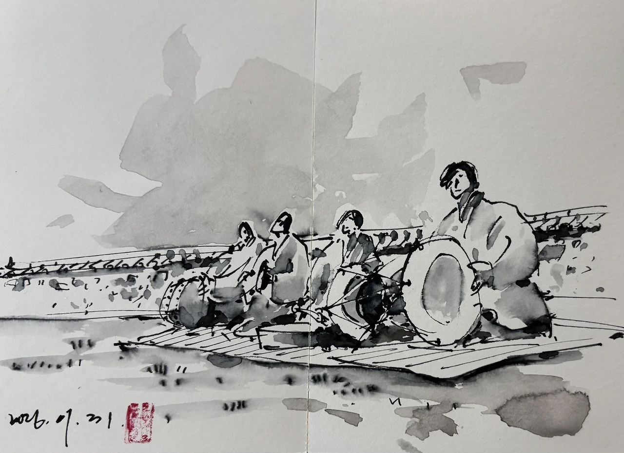 사물놀이에 빠진 사람들을 그리면서 생각하는 숫자 4. 어떤이들은 죽음을 뜻하는 수라 하고. 또 어떤 사람은 창조의 의미라고 정반대 주장을 한다.