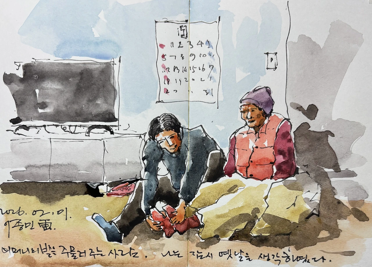 텔레비전을 한참 쳐다보았다. 그리움이었을까? 부러움이었을까? 아니면 후회였을까? 구십이 훨씬 넘은 노모의 발을 주무르고 있는 노인 아들의 환한 표정이 어머니 못지 않다. 아름다운 풍경이다. 그에 비해 나의 모자람은 한 두 가지가 아니었고 또 아님을 알겠다. 이제 와서 나는, 억지로 그 표정을 그려보려 한다.