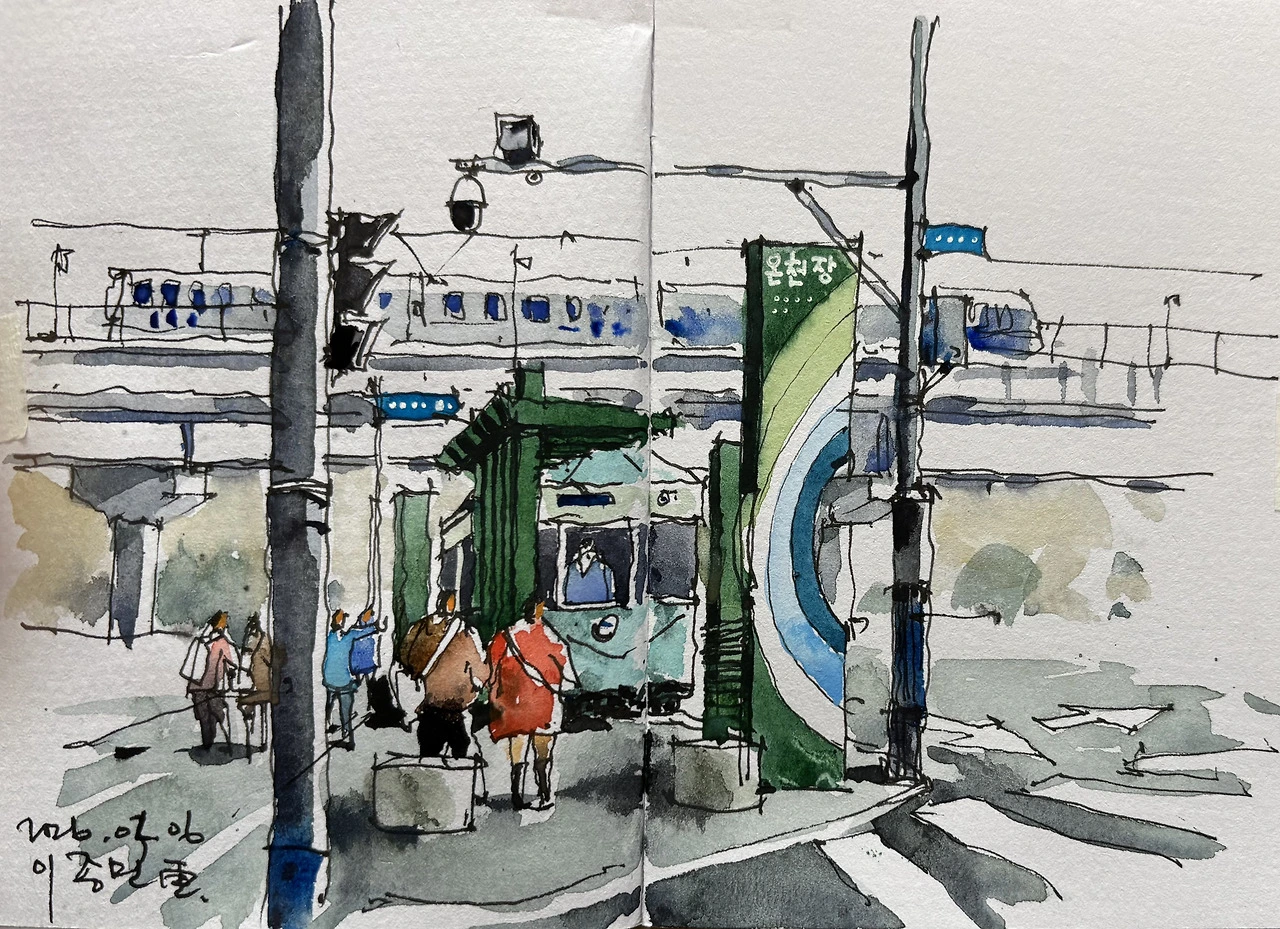 그때도 역명은 온천장역이었을 것이다. 멀리 전철이 지나가는 가운데에, 오래된 전차 1 대가 이미테이션으로 설치되어 있고. 요즘 사람들이 그것을 쳐다보고 이런저런 이야기를 나눈다. 책에서 본 사람들, 어른에게 들은 이야기, 혹은 나처럼 가물가물한 기억을 더듬기도 하고.