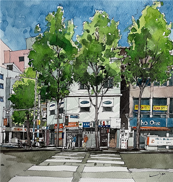 건널목 저편으로 보이는 일광상사는 제도 용품을 판매하는 오래된 상사이다. 부산에서 지도를 판매하던 유일한 곳이기도 하다. 견습생 시절부터 이 집을 드나들었다. 얼른 사진을 찍고 그림을 그려 두기로 하였다. 당시에 사용하던 0.2, 0.5밀리 로트링 펜을 특별히 사용하고, 다른 그림보다 유달리 선에 더 신경을 쓴 게 사실이다.