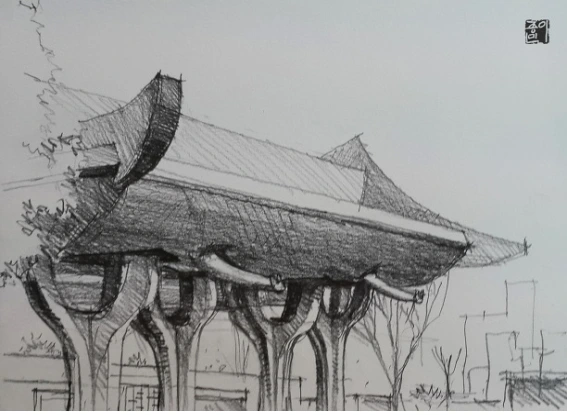 선생이 의도한 건축의 선은 굵고 힘차며 거침이 없다. 흰색의 용마루가 그렇고 튼튼한 여덟 개의 기둥이 당당하다. 용머리의 끝은 하늘로 치켜들고 처마의 선은 날아갈 듯 조선 여인의 치마 선과 같이 곱게 용머리와 한 방향을 지향하고 있으니, 이 둘은 부창부수다. 배흘림이 지나쳐 일견 도자기 형상을 한 기둥은 머리에 무거운 짐을 지고도 하나도 버겁지 않고, 사뿐 거리는 여인의 몸매처럼 매끈하다. 더욱 절묘한 것은 무거운 기둥과 미끈한 기둥이 놀라우리만치 가볍게 만나고 있는 것이다. 아래에서 올려다보면, 그 접합부가 연결되지 않고 비어있음을 확인하는 순간 그만 숨이 막혀 버린다. 병사들의 눈물을 형상화하였다고 하는 코끼리 코같이 삐져나온 모양의 물동이는 스승인 ‘르 꼬르뷔지에’ 선생의 영향이 곡선으로 재해석 된 것이다.