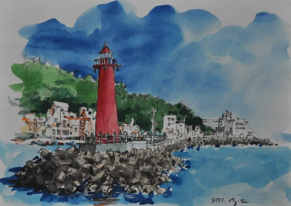 그런 생각을 뒤로 구불구불 급경사의 옛 길을 조심해서 내려가면, 이제 기차가 다니지 않는 동해남부선 길을 건너고 방파제를 지나 바다에 다다른다. 마치 계단을 내려가 지하의 어느 곳에 함몰된 듯 오묘한 안온함이 온몸을 스치는 순간, 마침내 도시의 틀에서 무장해제 된 나는 온전히 바다로 스며든다. 늘 그리던 투명함과 푸름에 한껏 빠지기도, 등대 너머 동해의 물살을 헤쳐 보기도, 마음이 더 부풀면 태평양에서 불어오는 훈풍에 실려 먼 이국땅에 다다르기도 한다.