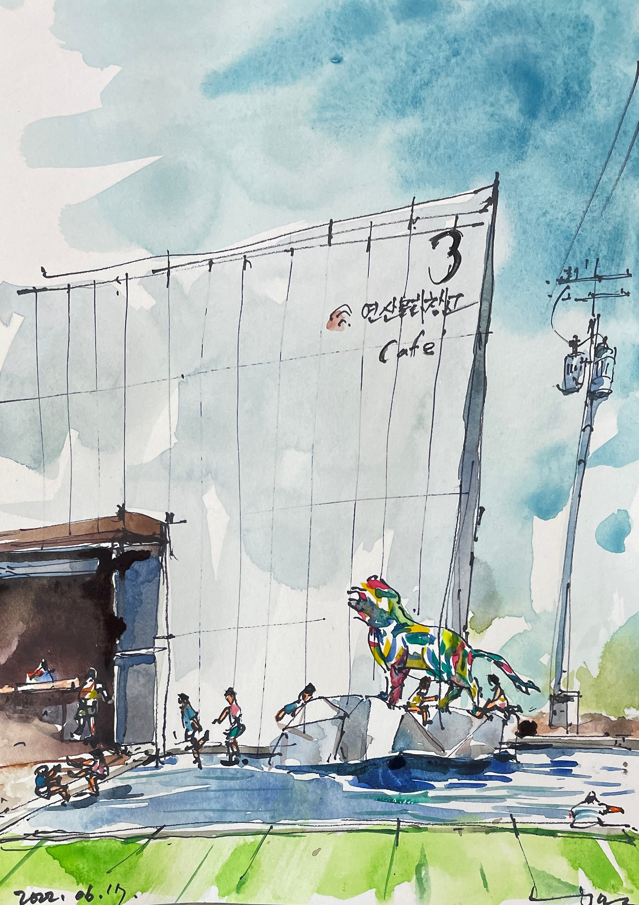 판매와 관람 위주의 이른바 도시재생에서 좀체 그려내지 못할 그림인 동네 놀이터나 학교 운동장의 풍경이 펼쳐지고 있다. 그것들은 놀랍게도 소량의 물을 매개로 하여 펼쳐지고 있다. 깊이 20센티미터 정도의 얕은 풀에서 아이들이 물방울을 튀기며 논다. 2~3분 전만 하여도 서로 몰랐던 아이들이었을 것이다. 그 주위로 군데군데 유명 예술가들의 설치물들이 놓여 있었는데, 아이들은 힐끗힐끗 쳐다보기도 하고 만져보기도 한다.