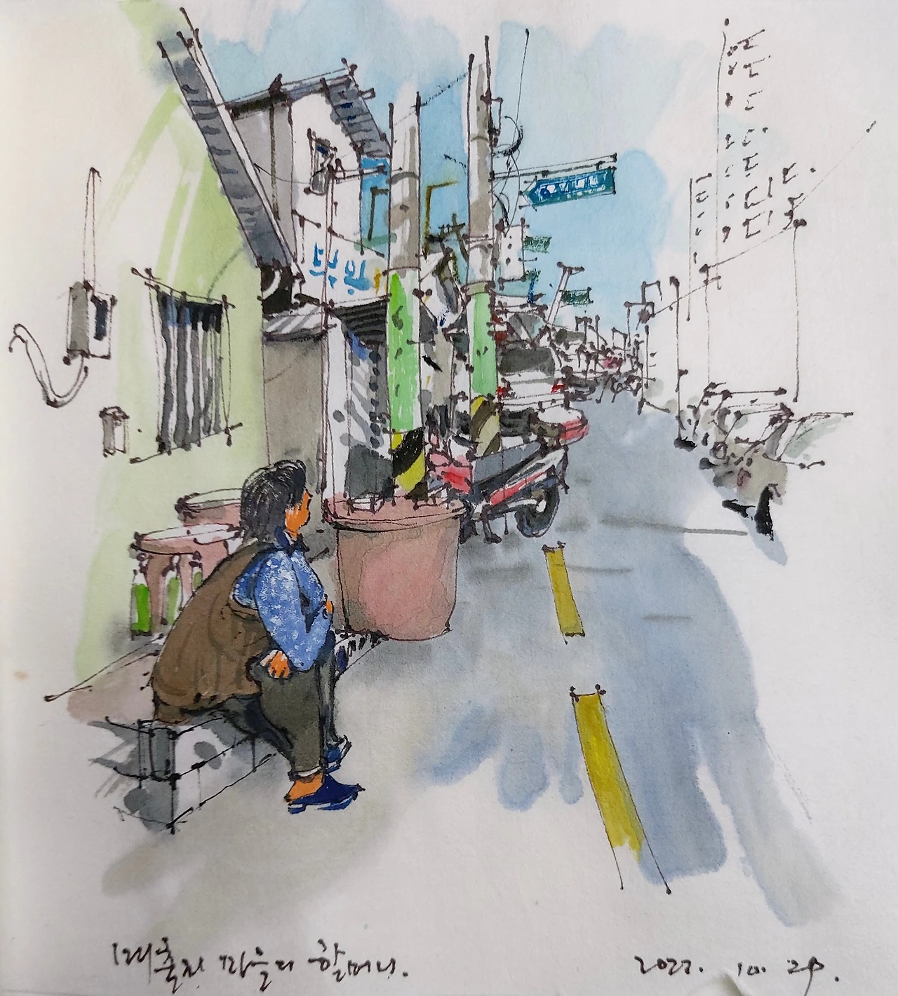 중앙동 그리고 동광동 / 사회에 첫발을 내디딘 그곳을 오랜만에 걸었다. 야외 스케치 중이지만 뜻하지 않게 몽롱하고 아련한 시간 속이다. 더러는 저세상으로 가신 오래된 사람들의 그때는 미처 몰랐던 온기와 사십 년 전의 음식 냄새, 그리고 퇴근 무렵에 느끼던 낡은 외투 속의 체온과 어슴푸레하고 약간 푸르렀던 거리의 색깔. 모든 것을 생생하게 기억해 내었다.