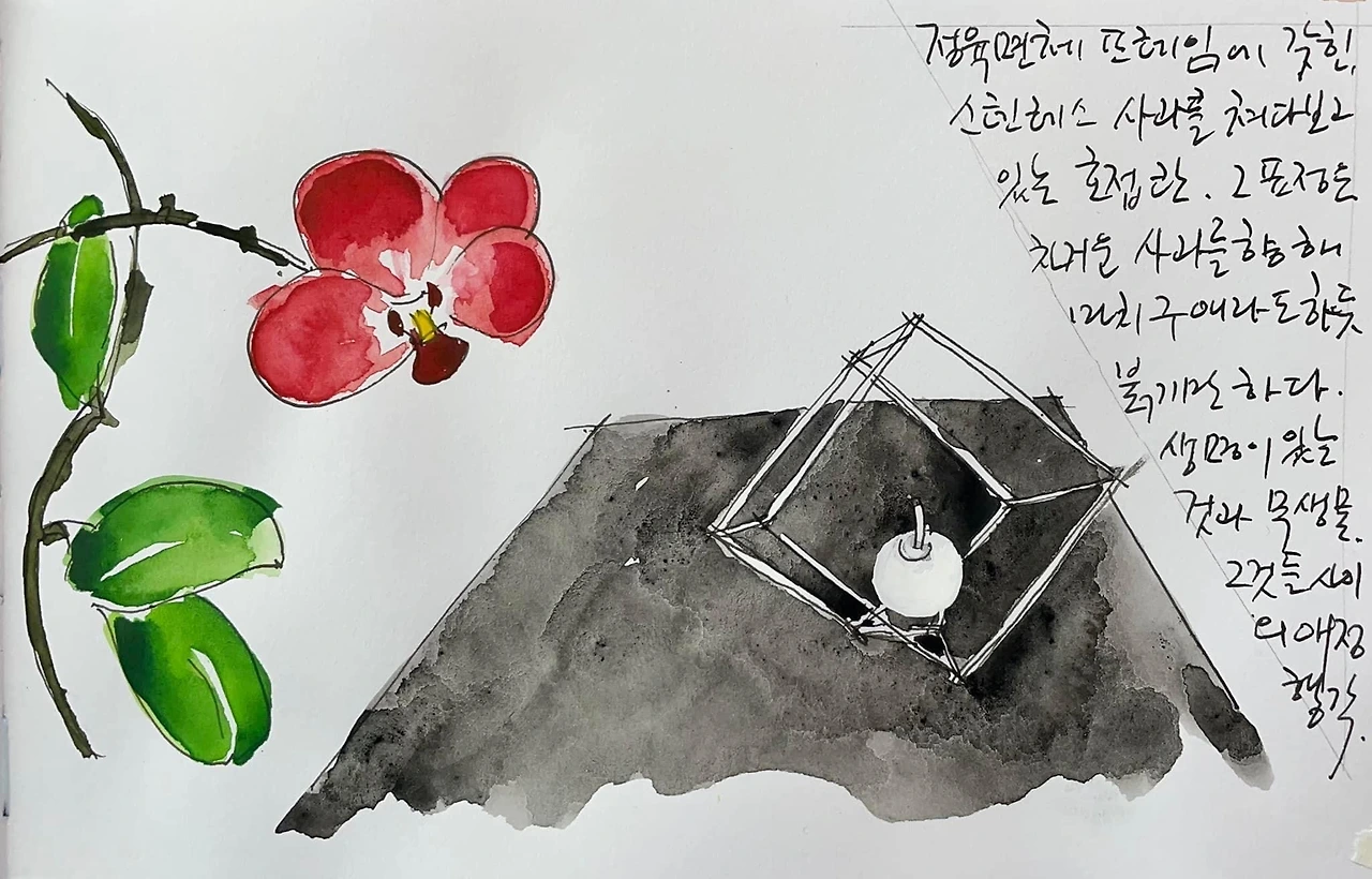 육면의 프레임에 갇힌 스텐레스 사과를 쳐다보는 호접난. 마치 구애라고 하듯 붉기만하다. 생명이 있는 것과 무생물 사이에도 끌림은 있는가 보다. 하물며 사람에서랴. 가급적 모든이를 사랑하기로 하자.