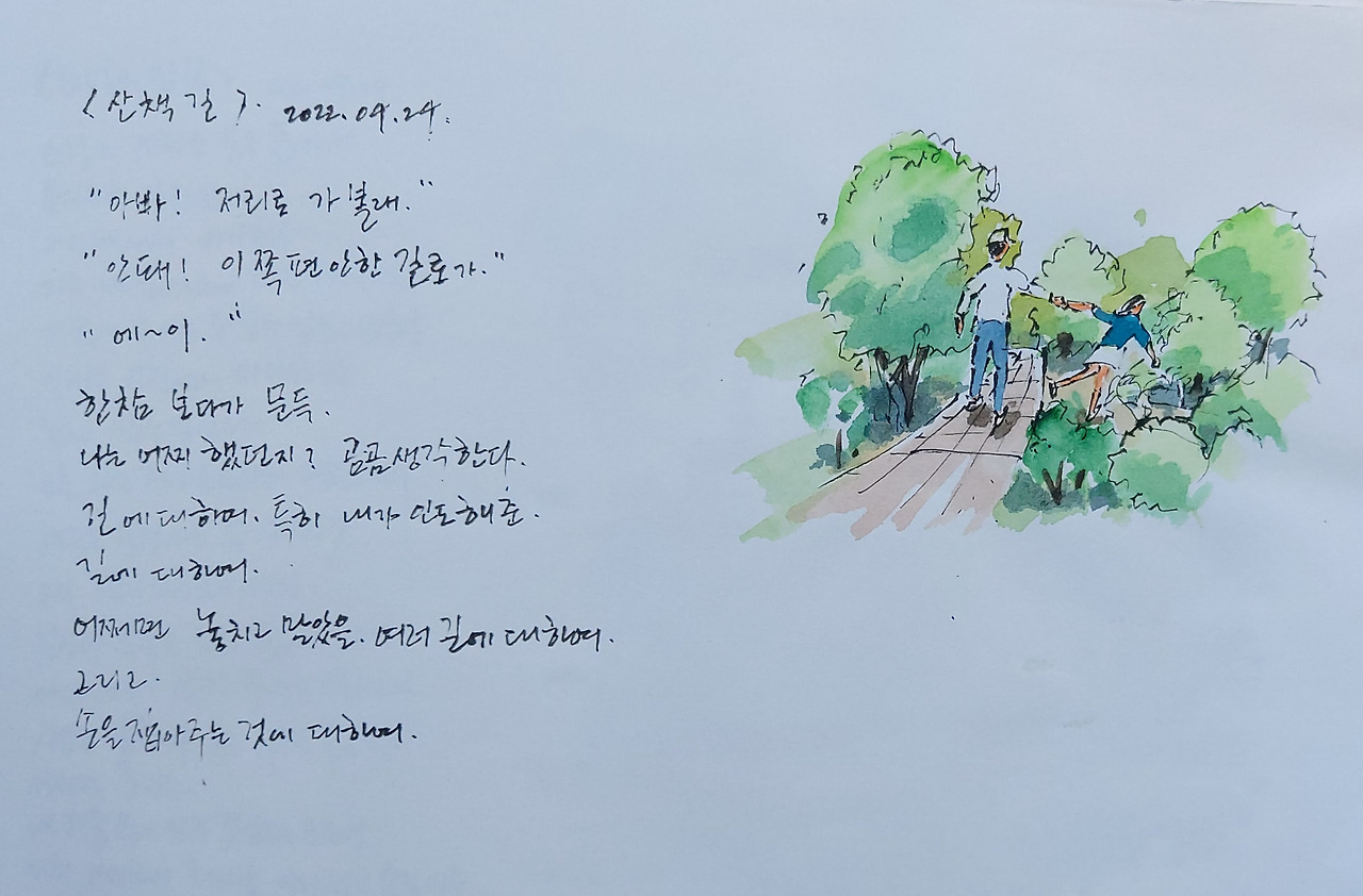 묵묵히 걷다가 듣게 된 말. “아빠! 저리로 가 볼래” “안돼! 이 쪽 편안한 길로 가.” “에이~” 결국 아이가 졌다.