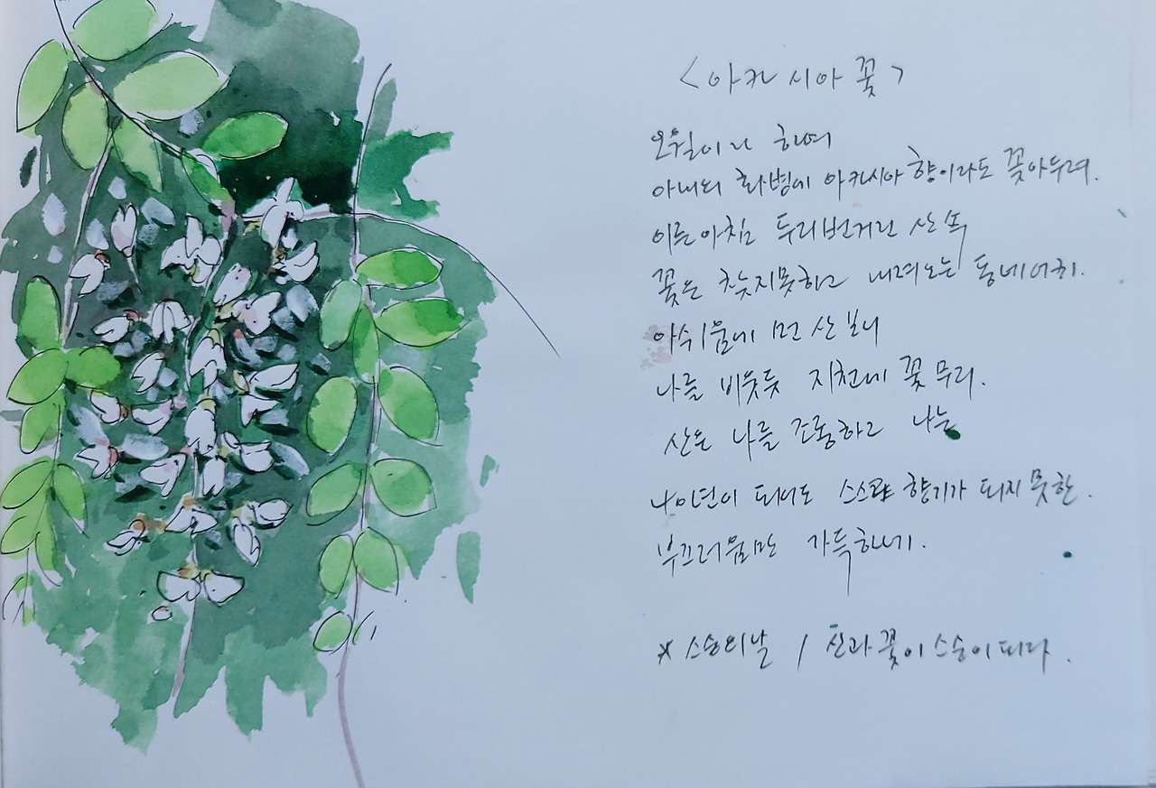 오월이라 하여, 아내의 화병에 아카시꽃 향이라도 꽂아두려. 이른 아침 두리번거린 산 속. 꽃은 찾지 못하고 내려온 동네 어귀, 아쉬움에 되돌아 보니. 나를 비웃듯 먼 산 지천에 꽃 무리.