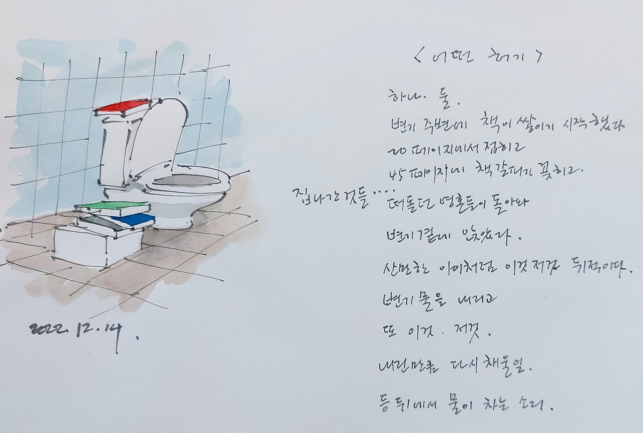 하나, 둘. 변기 주변에 책이 쌓이기 시작했다. 20 페이지에서 접히고, 45 페이지에 책갈피가 꽂히고.