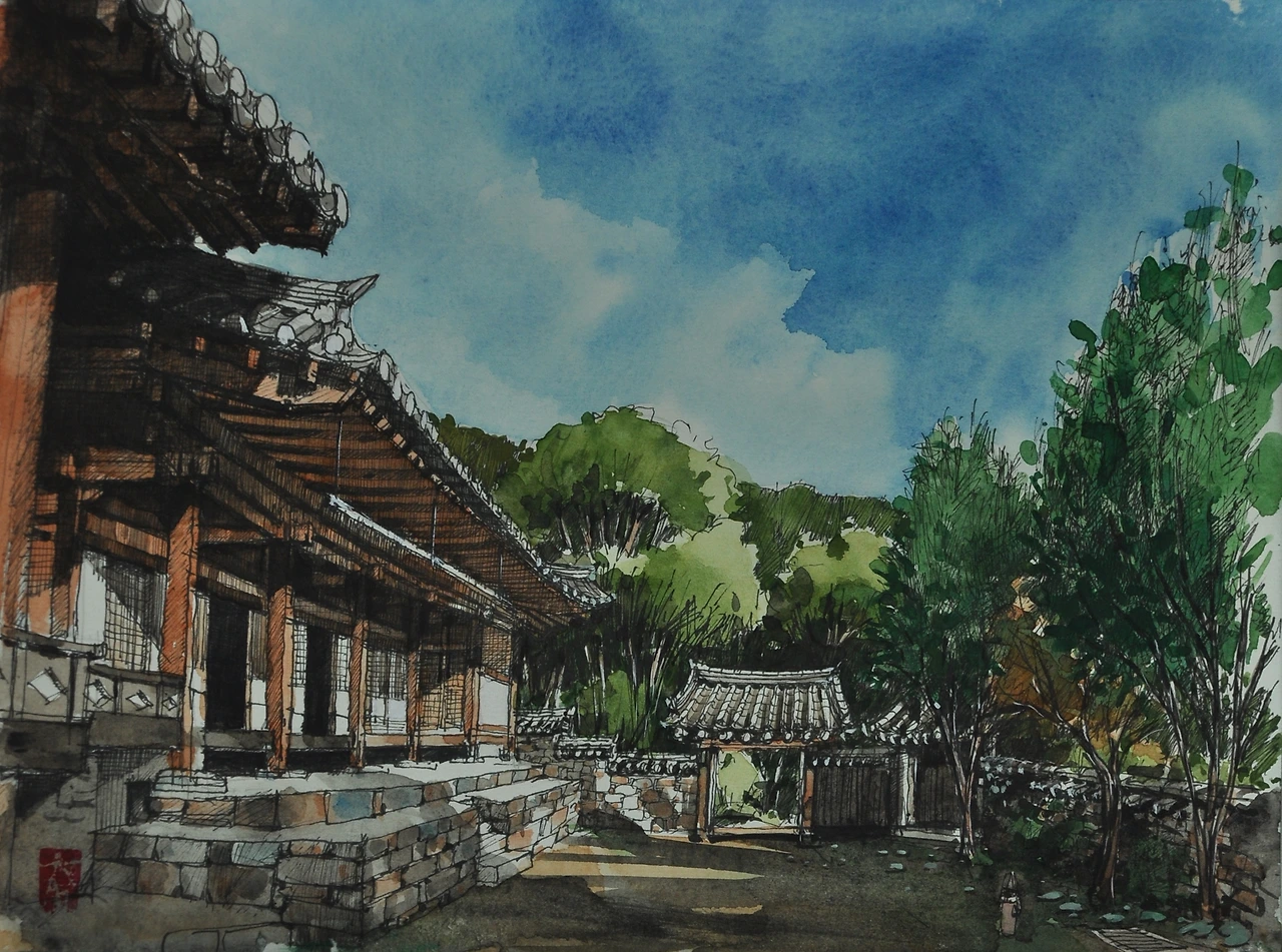 이전에도 그랬는데, 오늘도 경내의 곳곳이 수리 중이다. 하지만 사찰의 완벽한 전경을 내 스케치북에 다 담지 못한다 하여 무엇이 문제가 될까? 나는 복원 후의 말끔한 모습을 상상하며, 곳곳에 둘러쳐 있는 공사용 차단막 또한 아름답게 보기로 하였다. 설령 그 복원이 원형에서 조금 빗나간들 어쩌랴. 사찰은 창건의 역사와 관계없이 엄연히 종교가 이루어지는 현세의 도량이니 현대적이고 실용적이어도 무방할 것이다.
