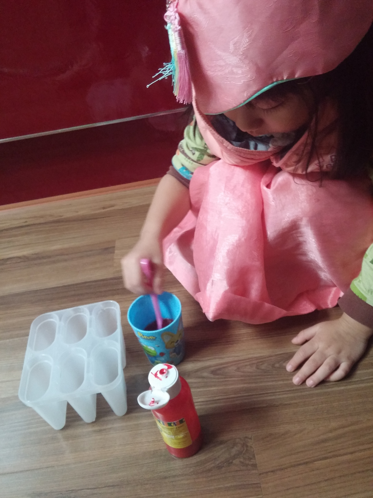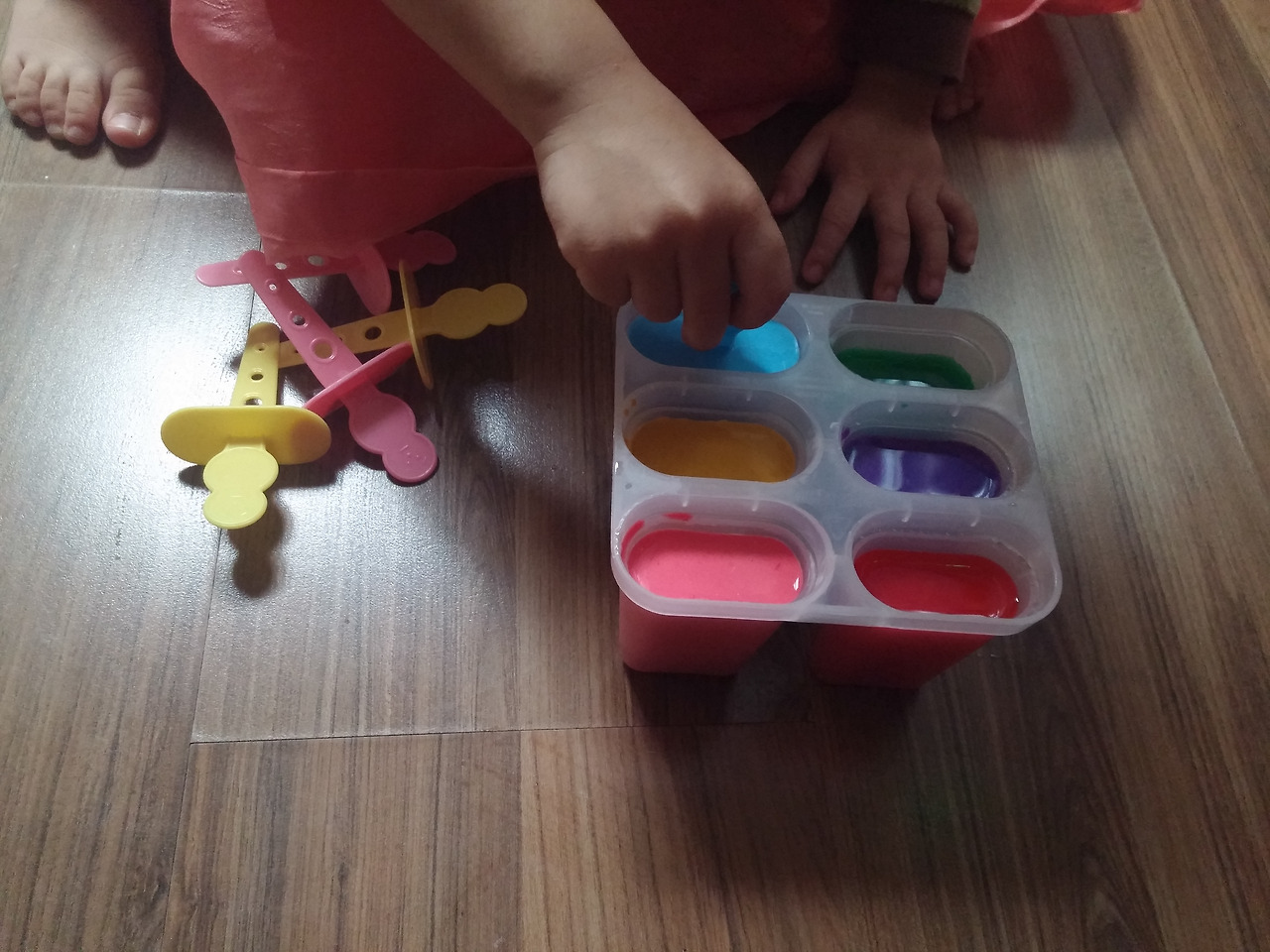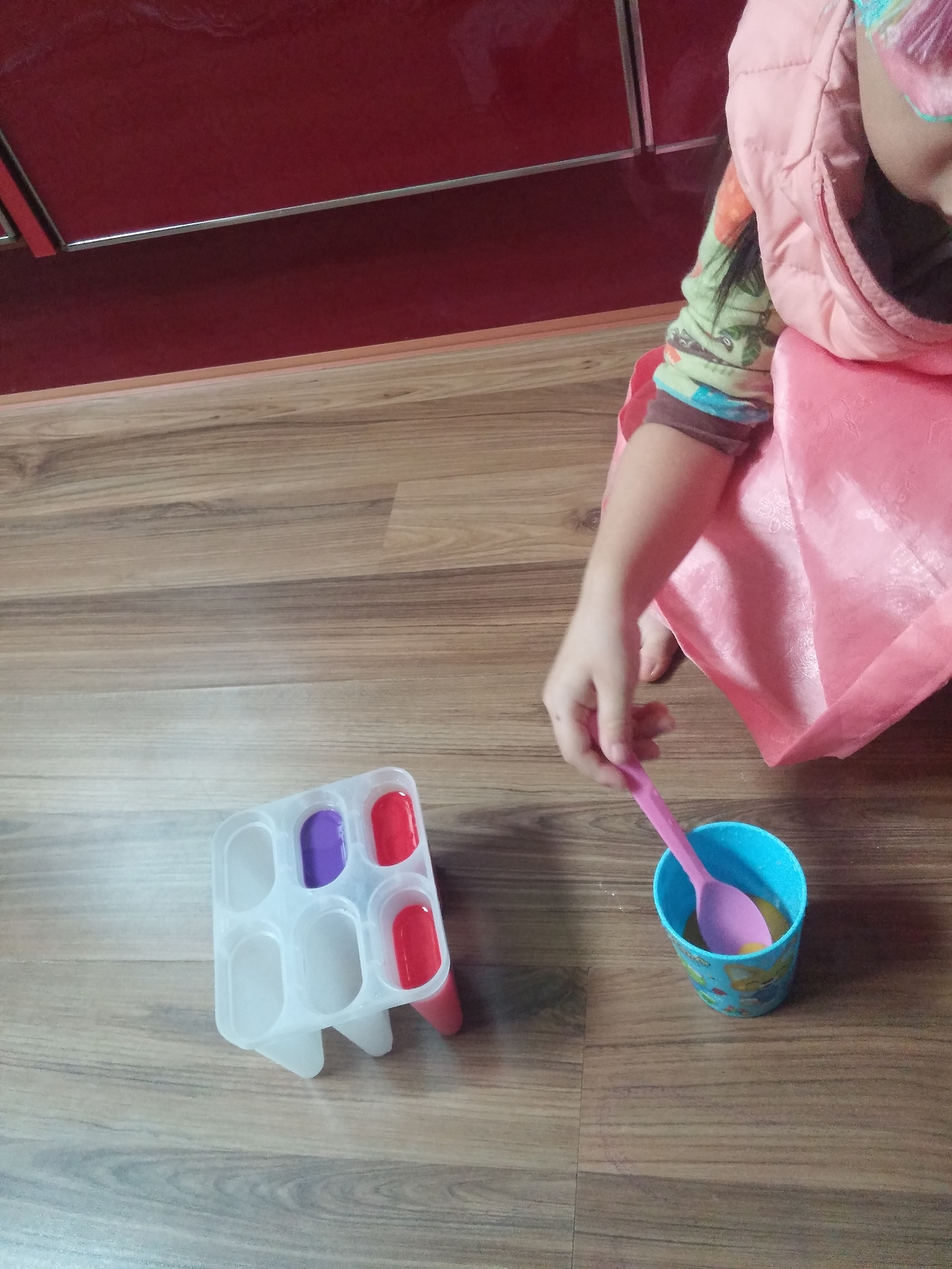 물감을 푼 물에 아이스크림 막대기를 꼽아주고