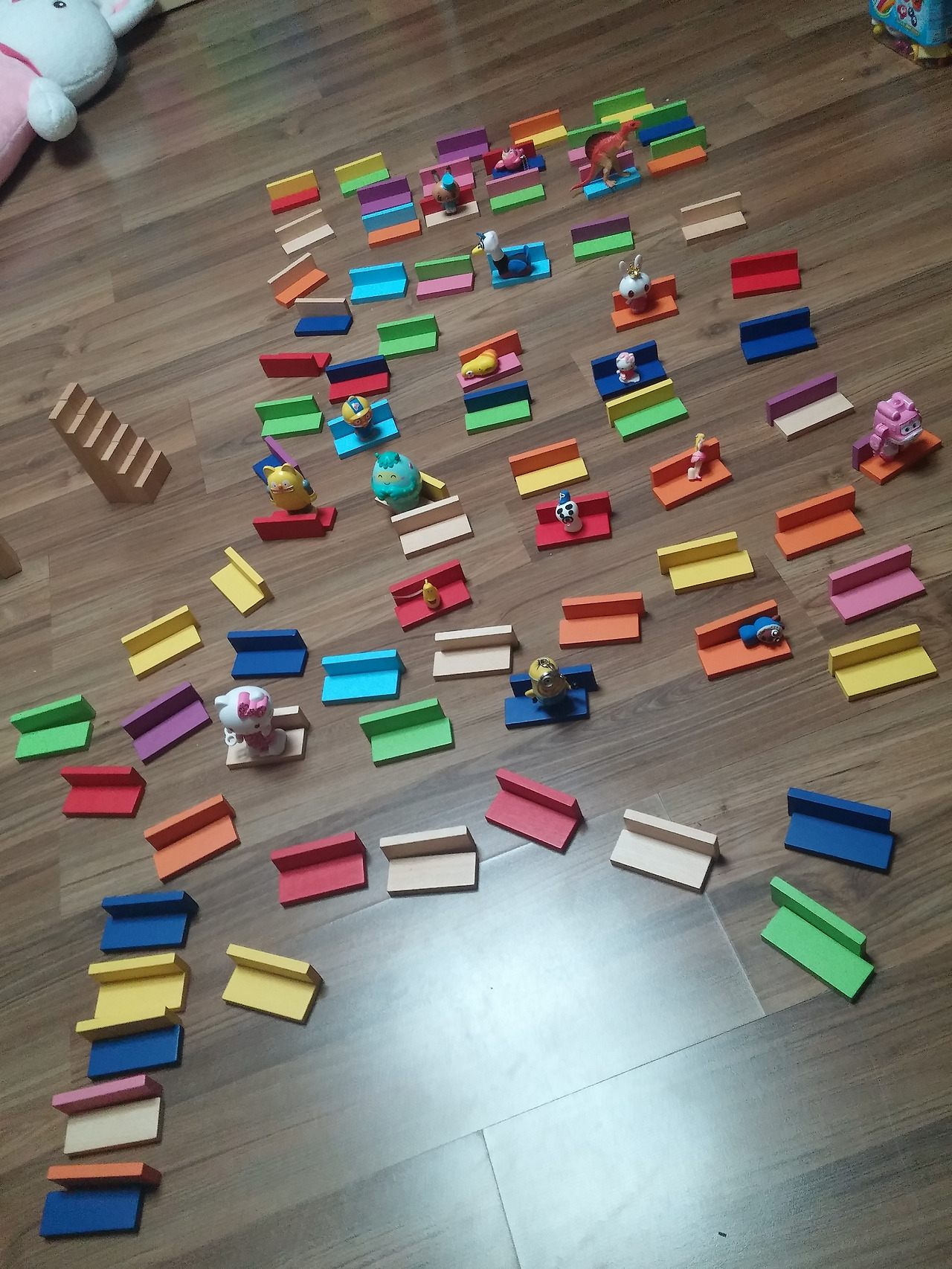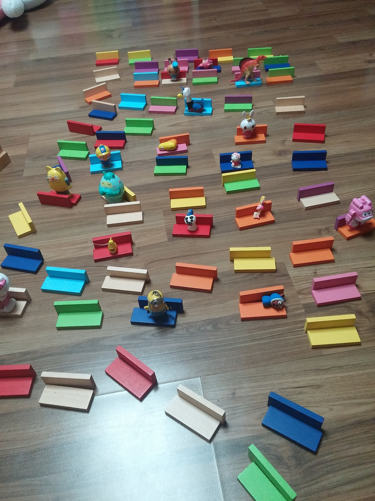 아이는 도미노를 꺼내 놀다 의자를 만들겠다며 거실 하나 가득 색색의 의자를 만들어 장난감을 앉아 쉬게 해 주었다