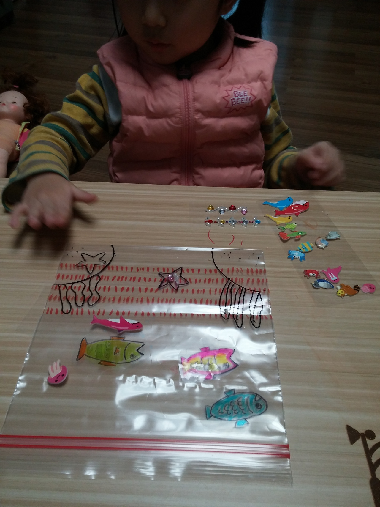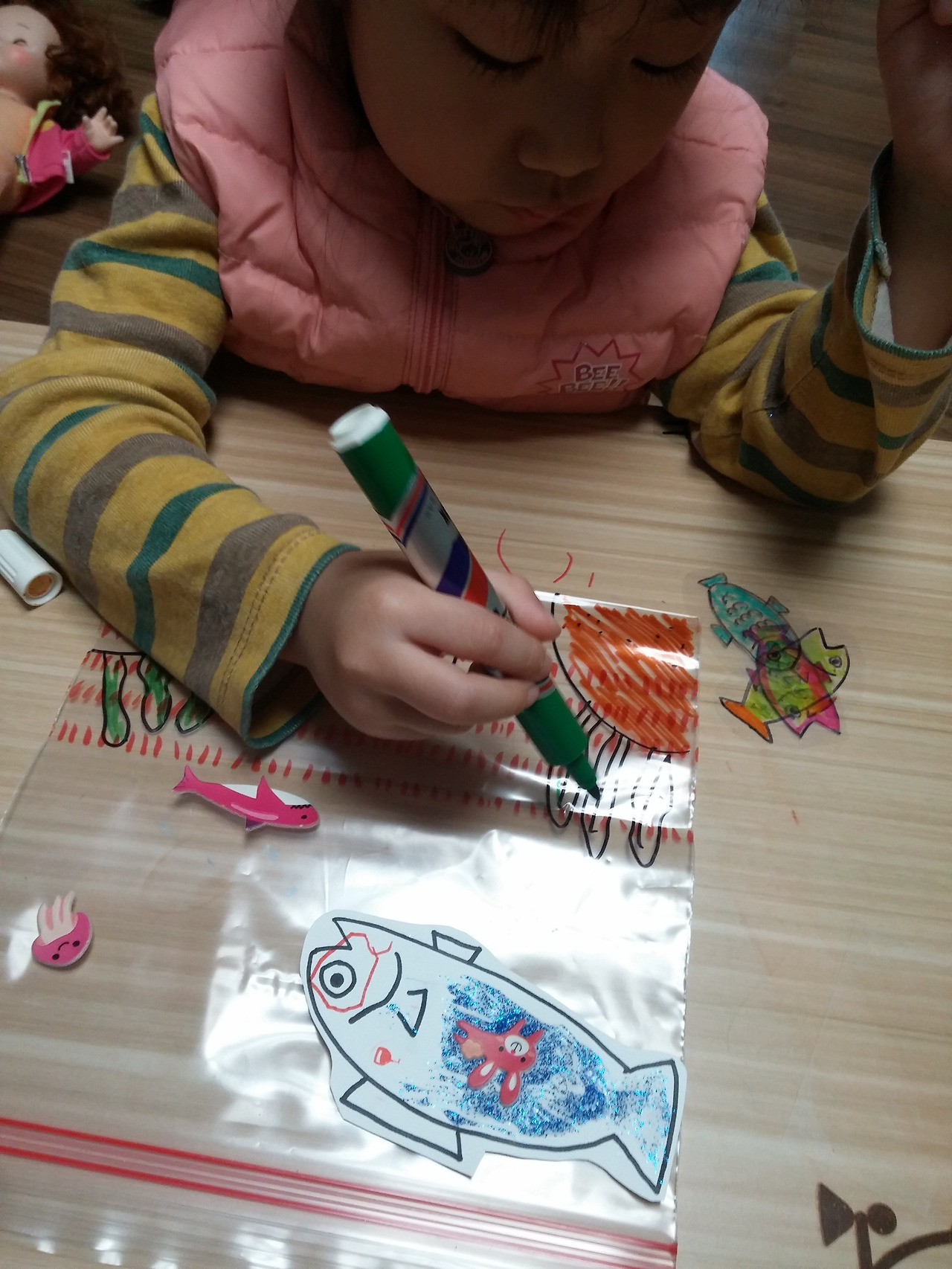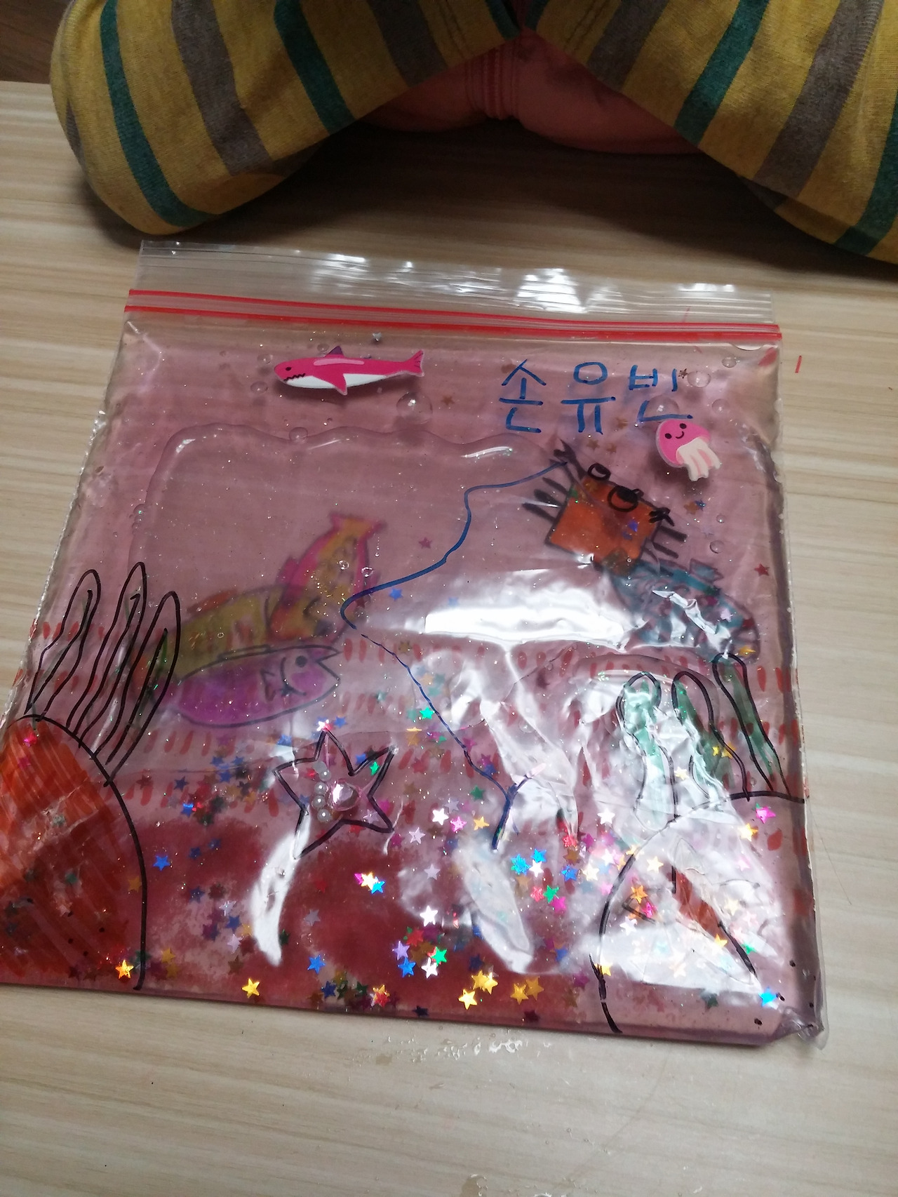 지퍼백 겉 면에 바닷 속 그리기와 꾸미기