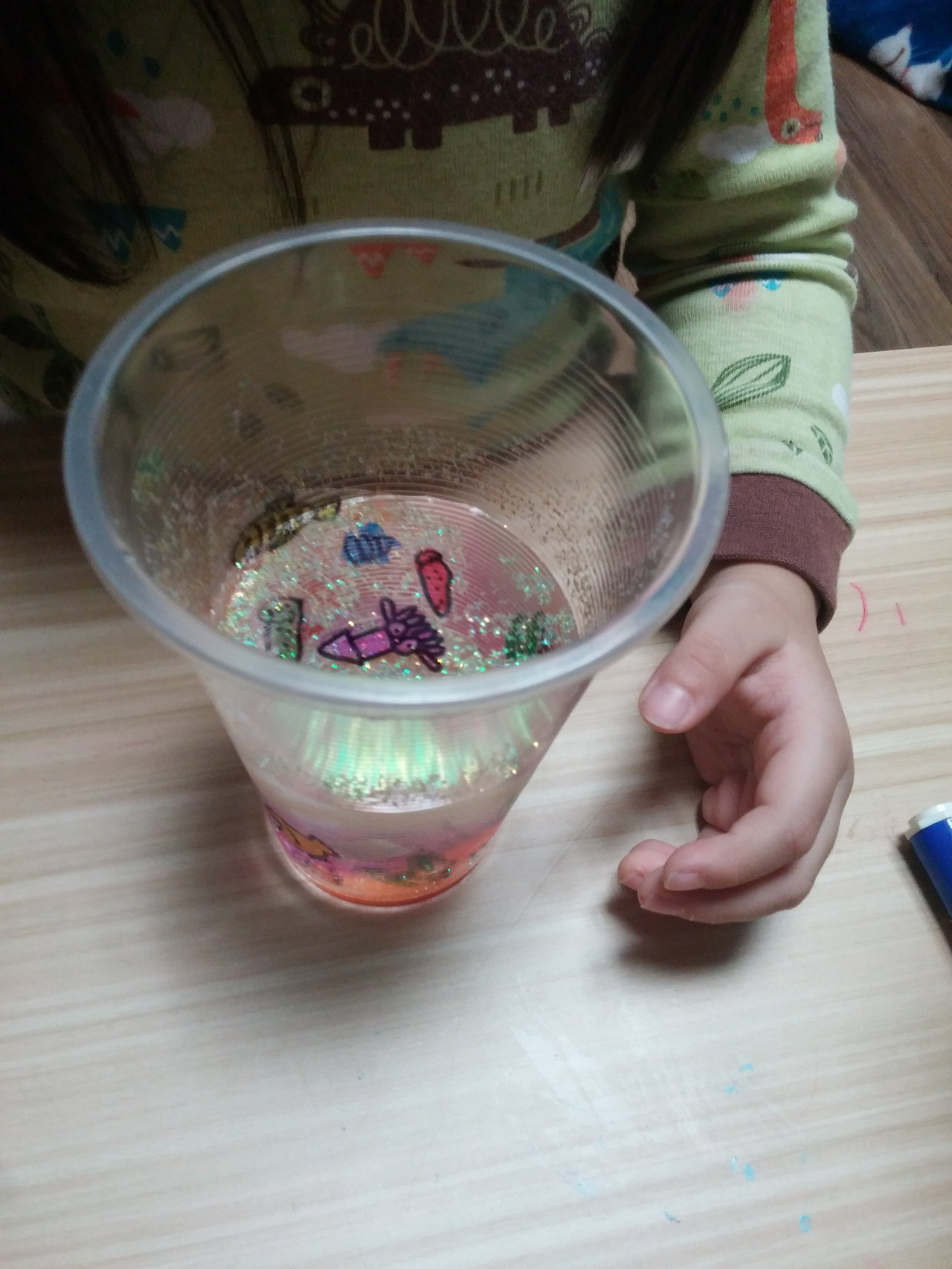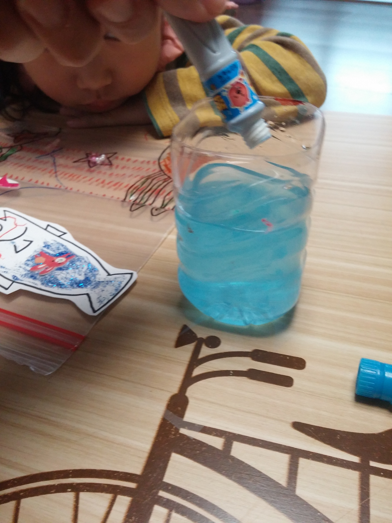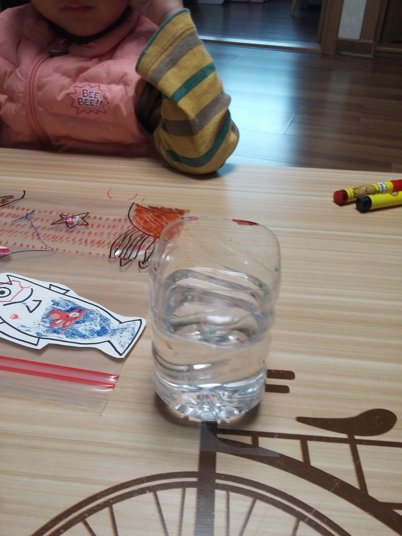 필름지에 바다 동물 그려 붙이고 물 속에 넣어주기