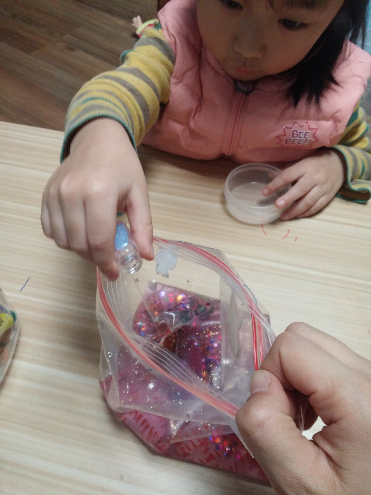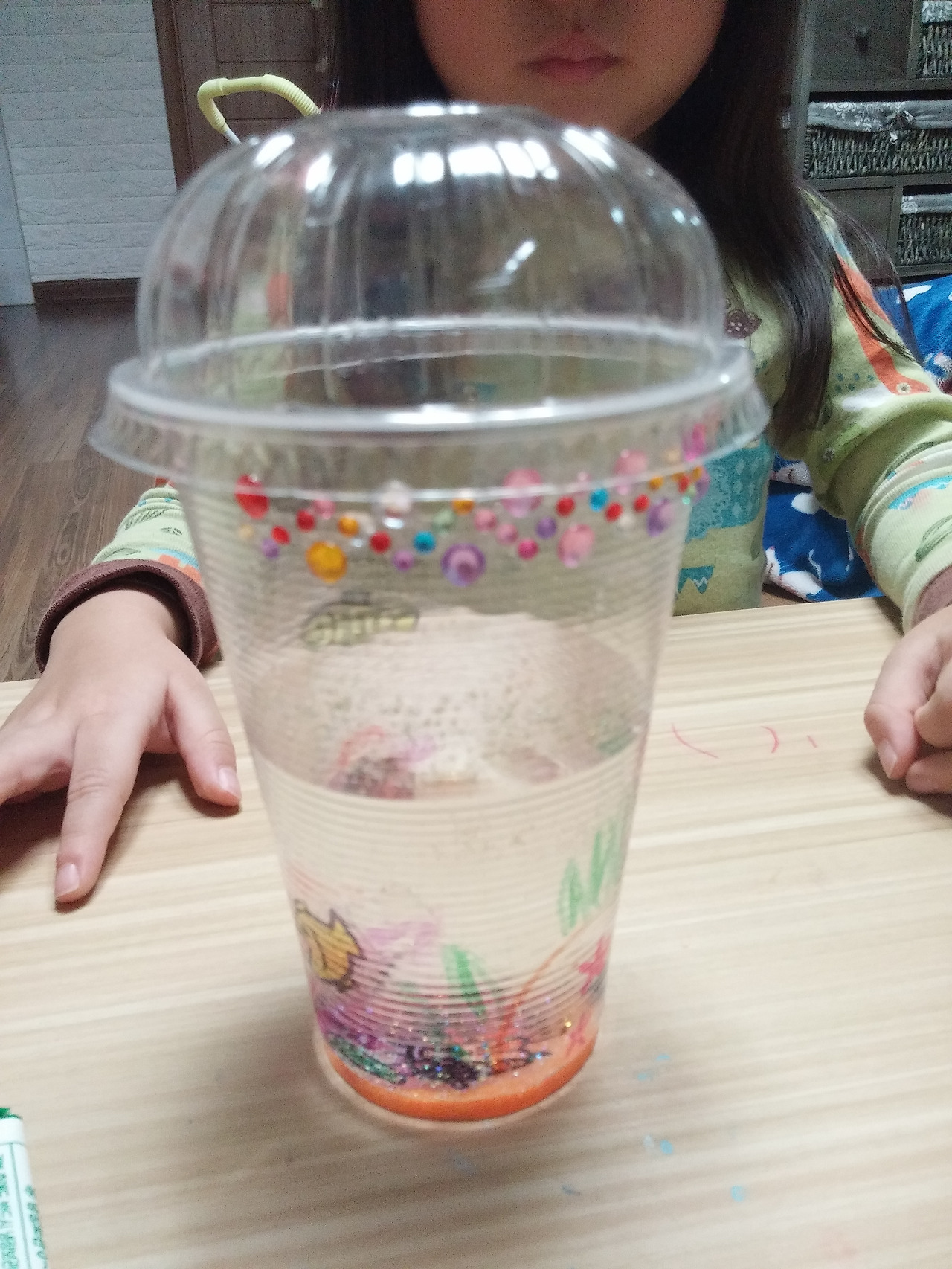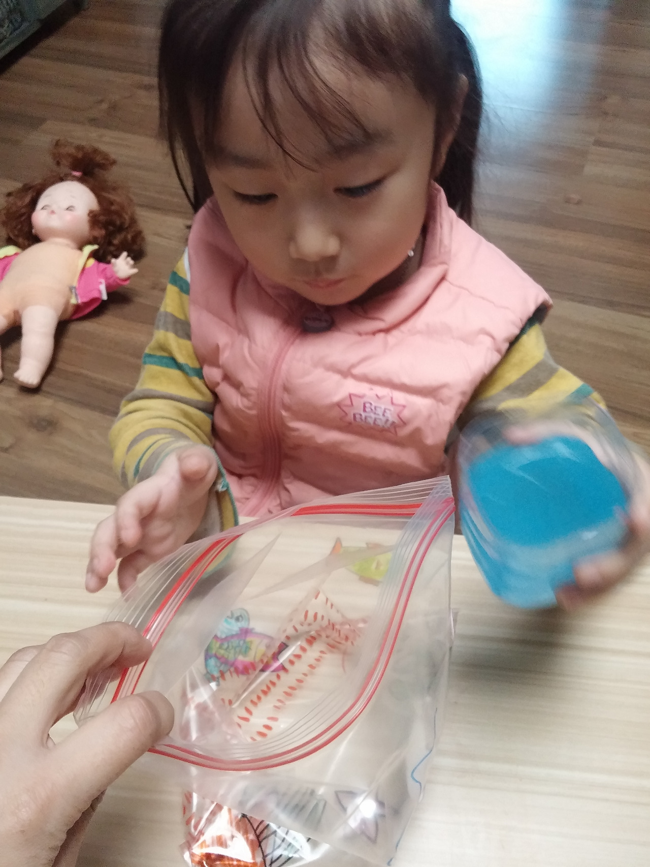 딸 아이가 바닷 속에 모래도 있다며 색모래를 넣는다고 해 색모래를 꺼내주니 빨간 색 모래와 하늘 색 반짝이를 선택했다