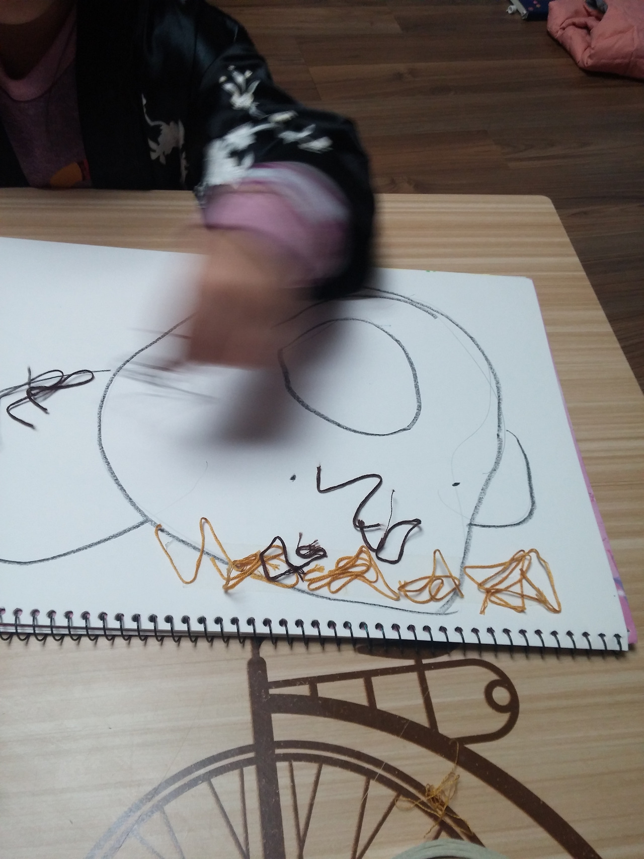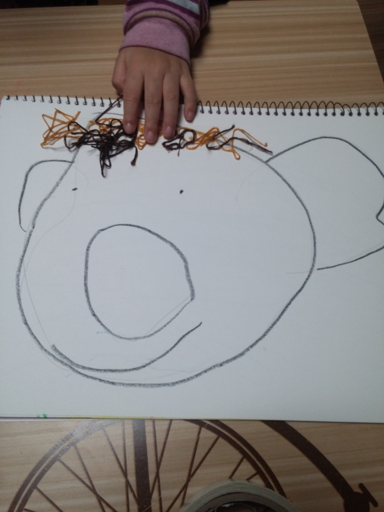 2.머리부분에 양면 테이프를 붙이고 실로 머리카락을 표현한다. (미...역...인간인가???)