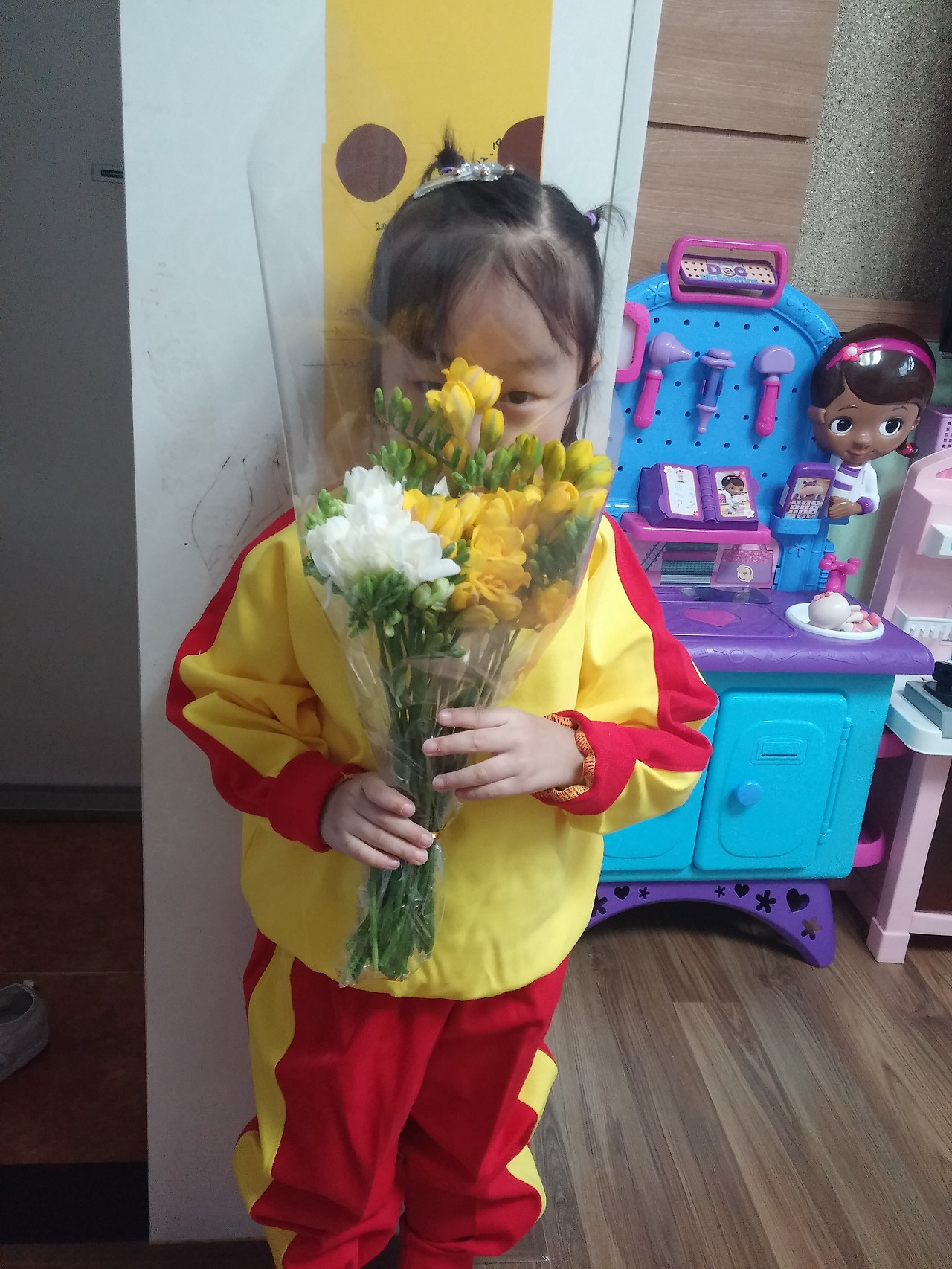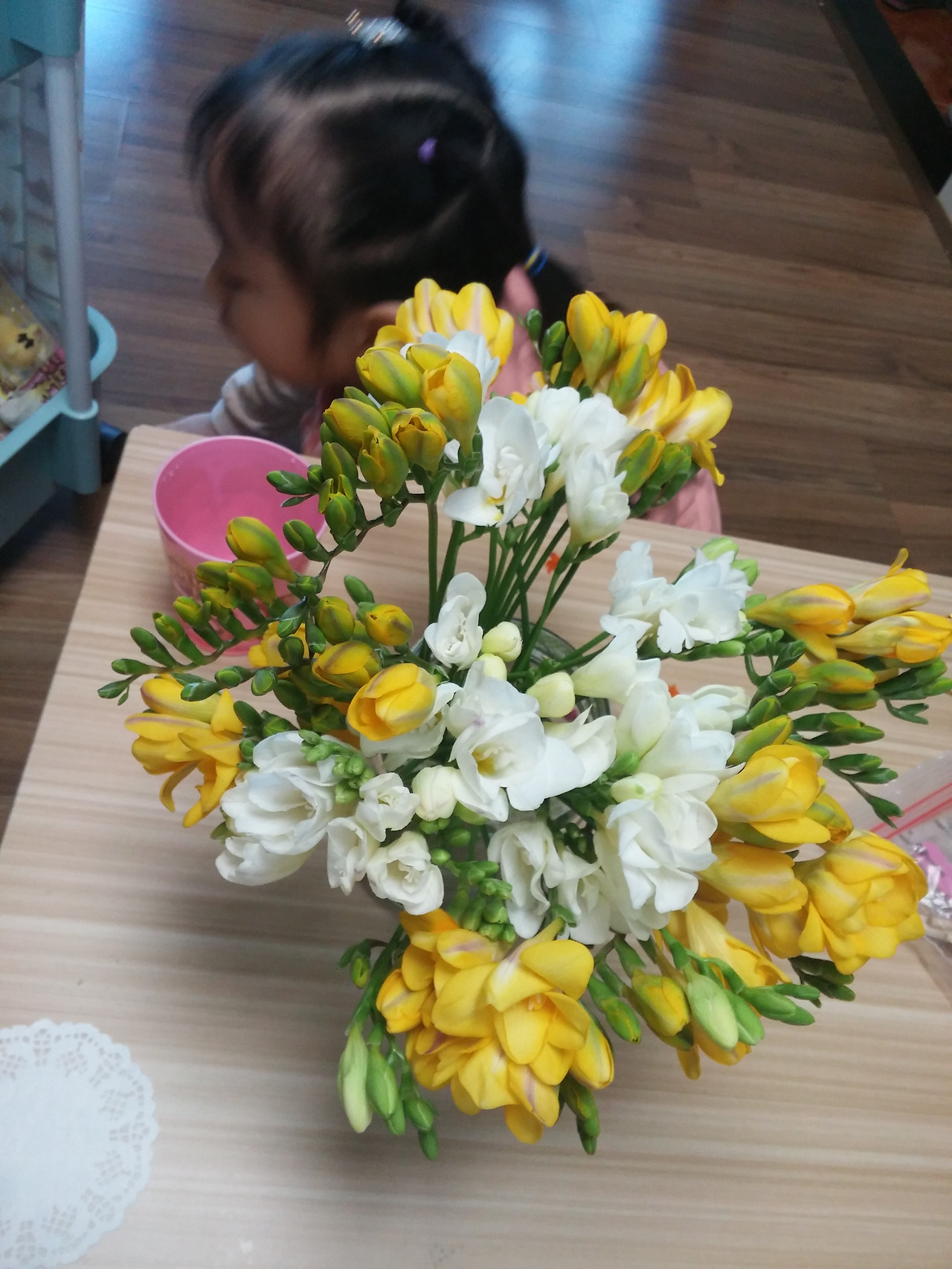 그러더니 우리 집에 옛날 봄처럼(작년을 말하는듯 하다) 꽃이 있었음 좋겠다고 몇 번을 말해 아이에게 꽃 집을 지날 때 원하는 꽃을 물어 본 후 어린이집에 아이를 데리러 갈때 아이가 고른 후리지아 4단을 사 가지고 갔다