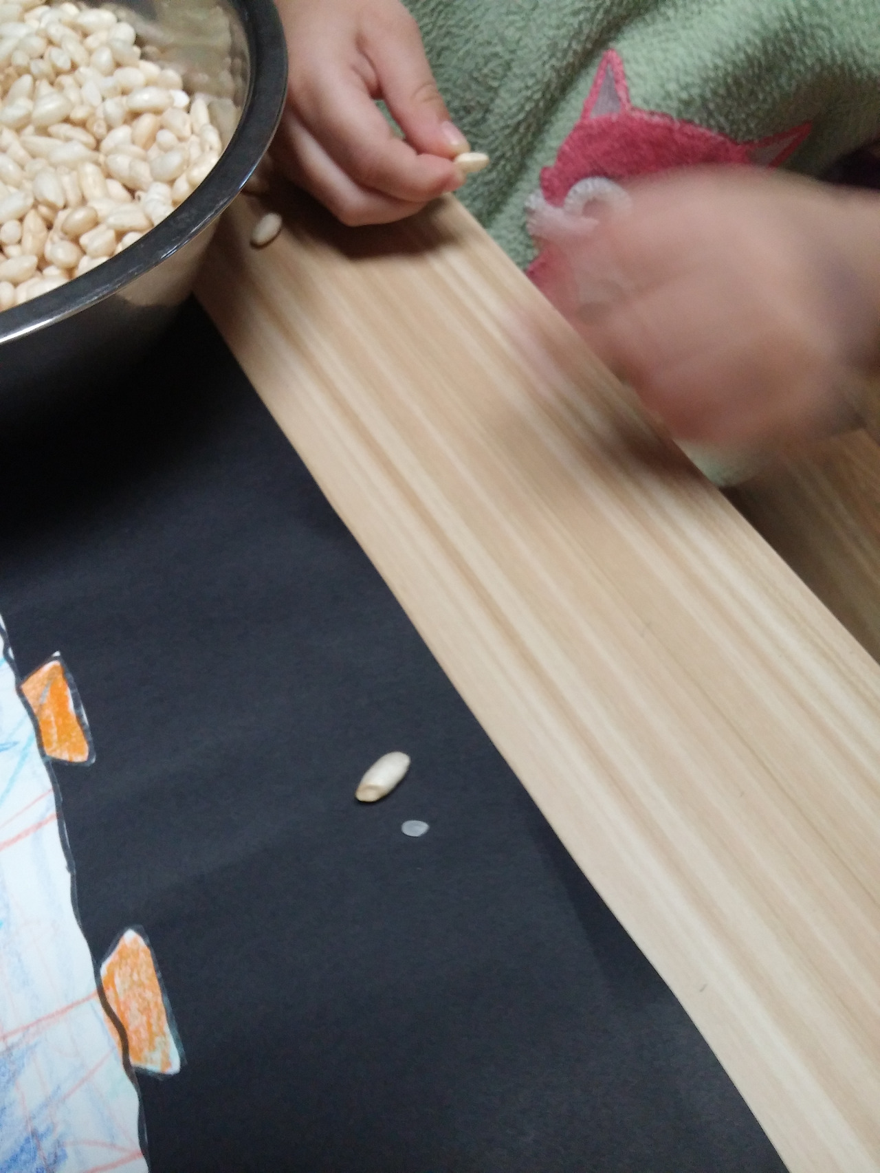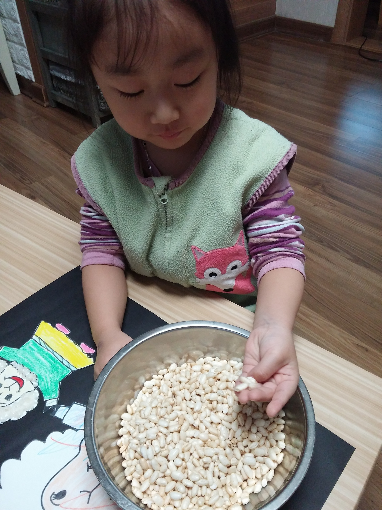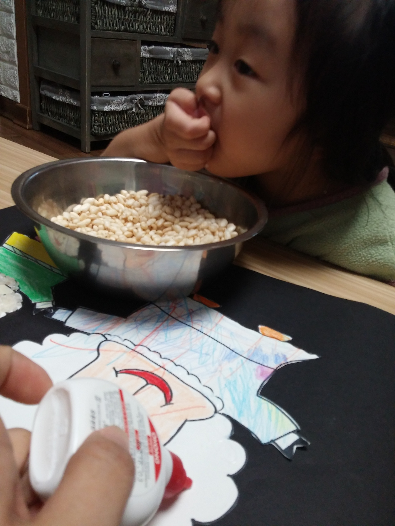 목공풀을 칠하는데 정신없이 튀밥을 먹는 아이