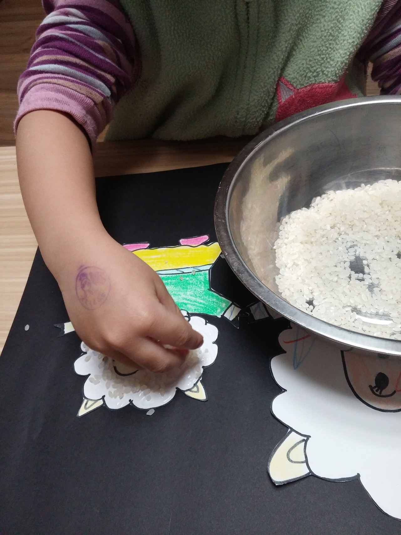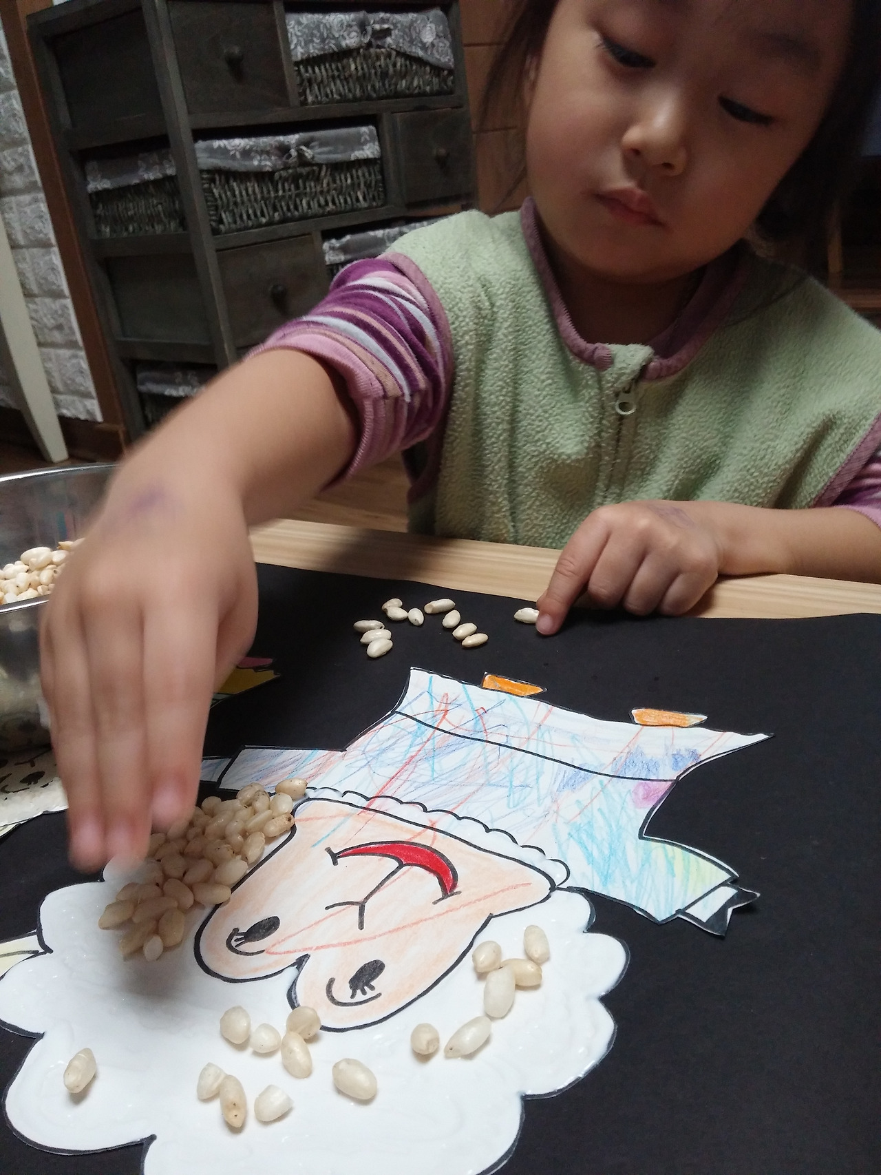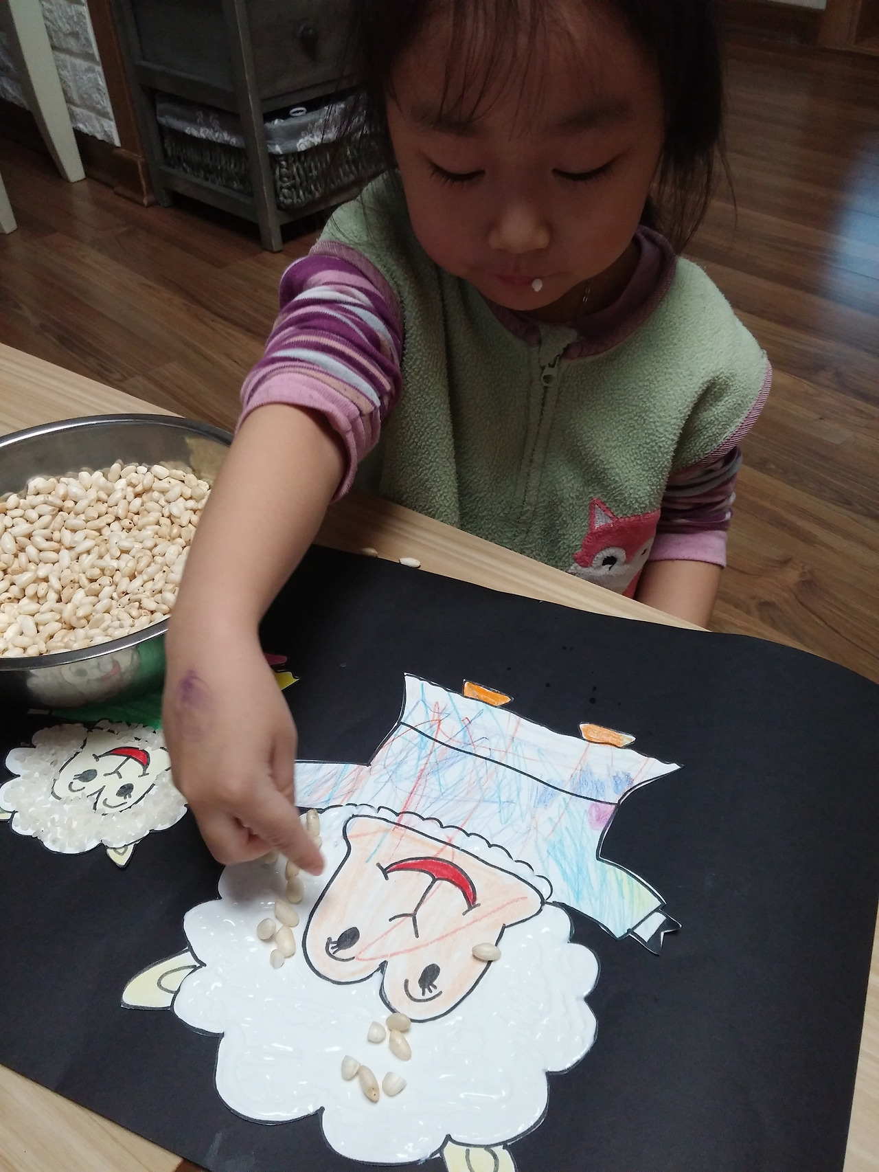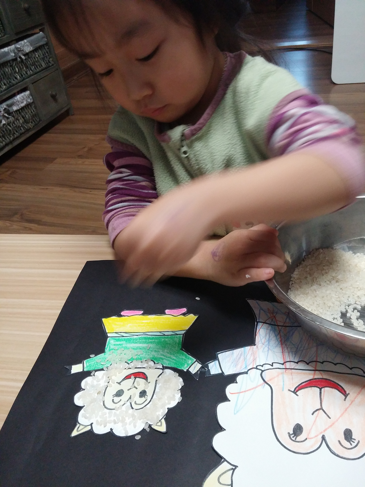 쌀 알을 뿌리거나 붙여가며 양 털을 표현해 준다