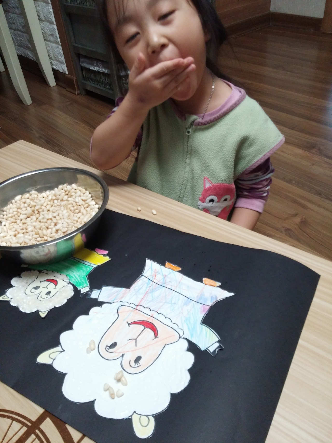 양 그림.쌀.목공풀.쌀튀밥.그릇.검정도화지