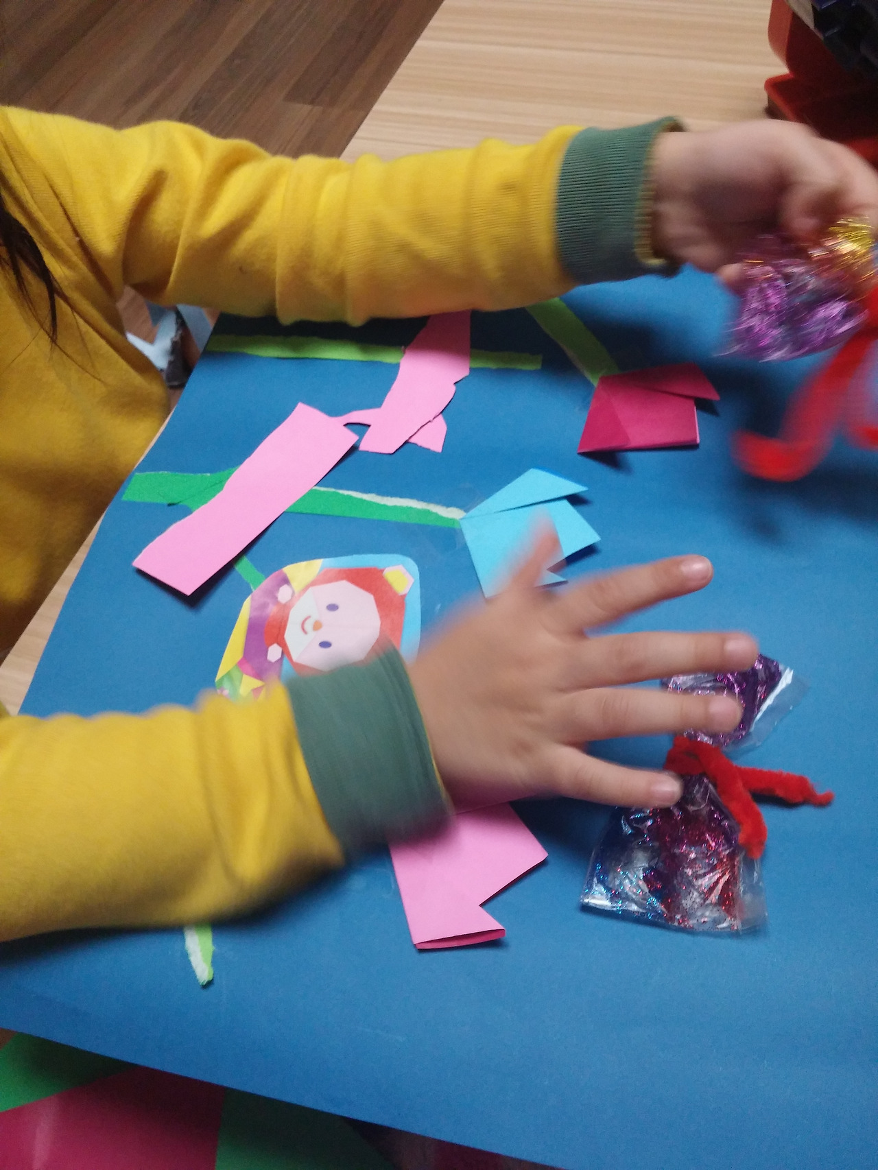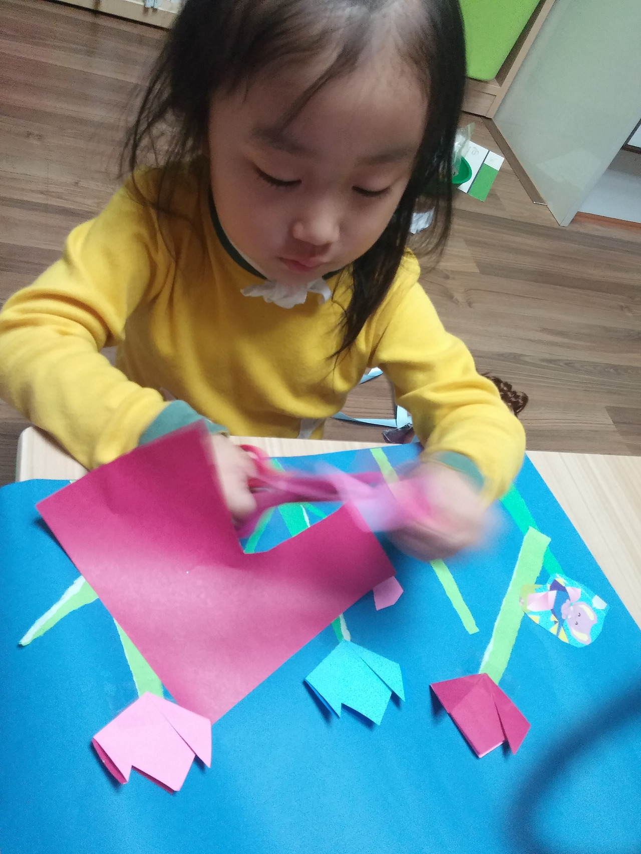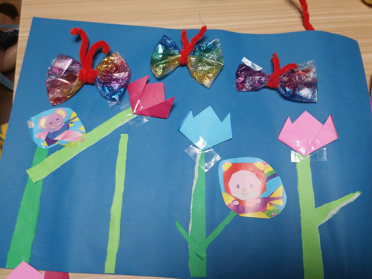 색종이로 꽃밭을 만들고 나비에 양면 테이프를