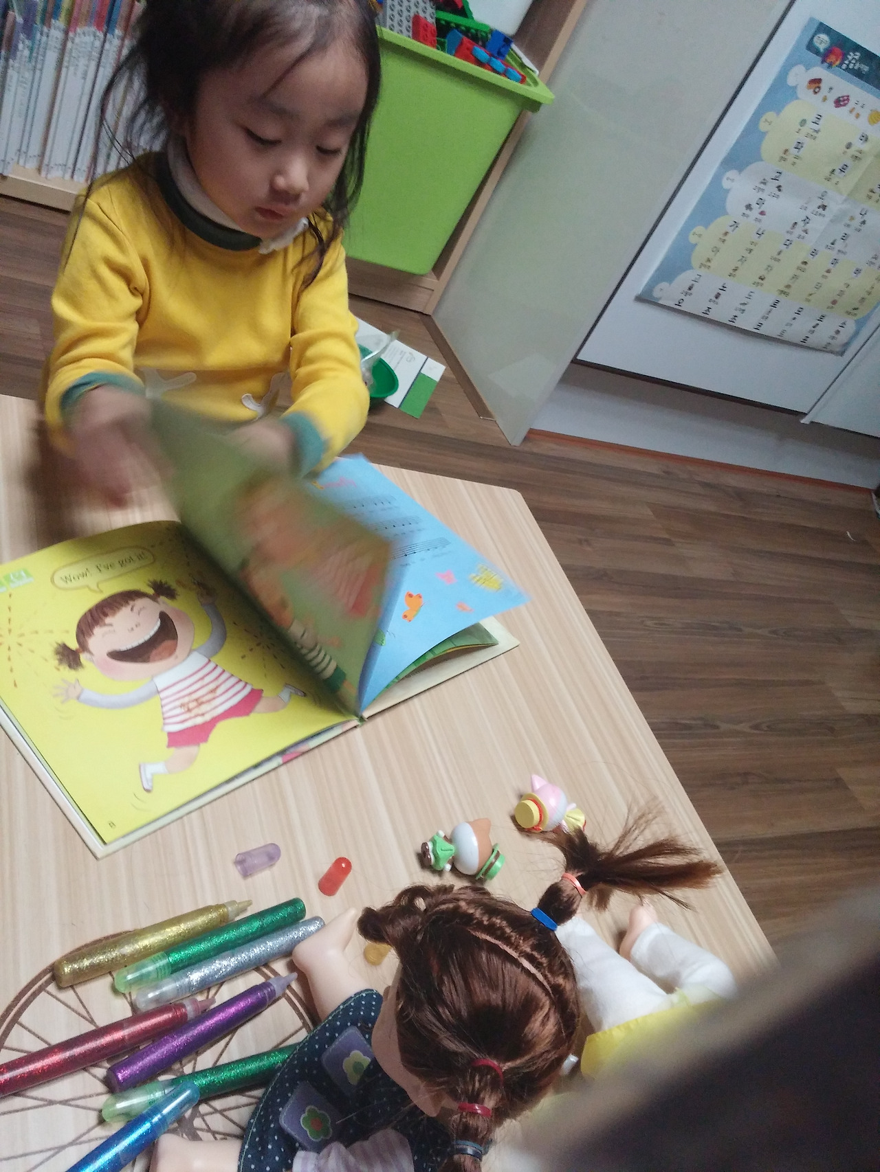 딸 아이는 선생님처럼 책을 본다...인형들이 학생이라 보여줘야 한다며...