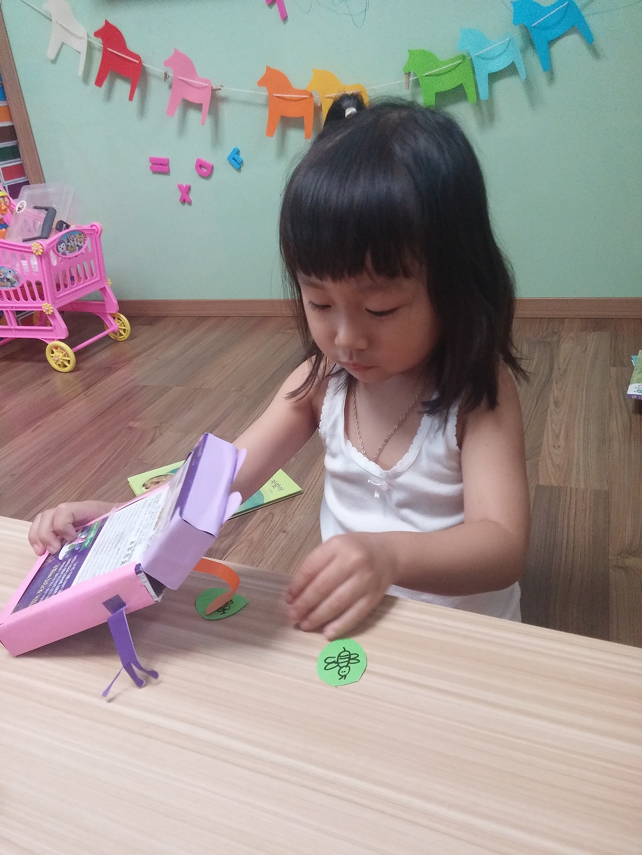 잡은 곤충은 과자통 속으로 넣어주고 개구리가 똥을 싼다며 꺼내주면 아이가 깔깔거리며