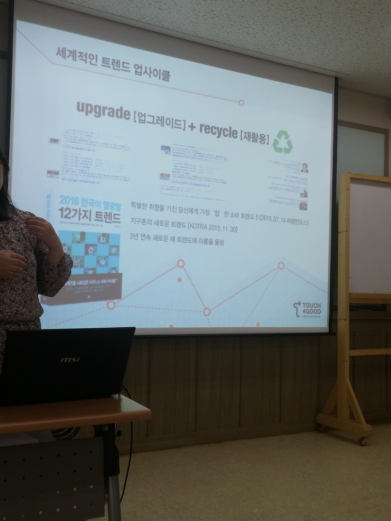 TOUCH 4 GOOD 이라는 사회적 기업에서 업사이클링에 대해 강의를 해 주셨다.