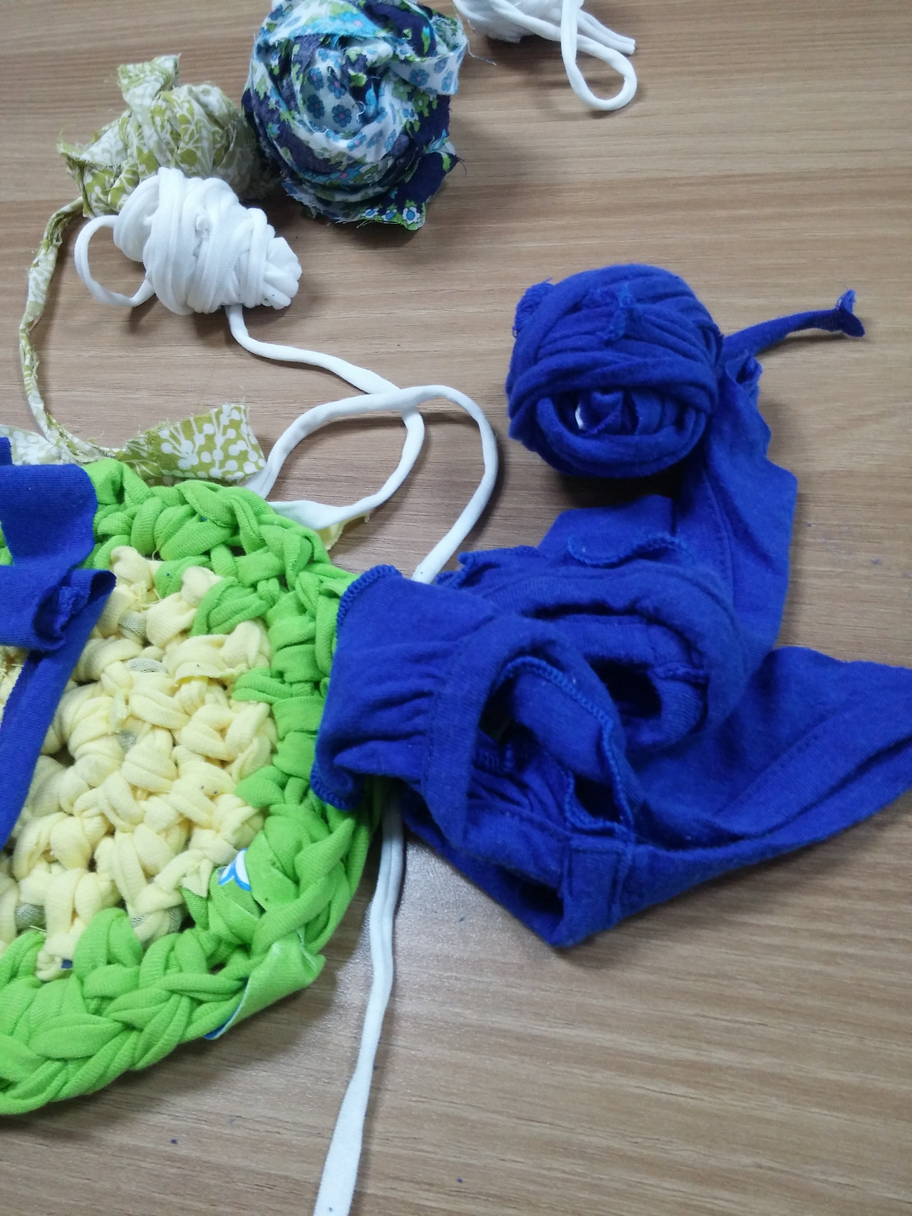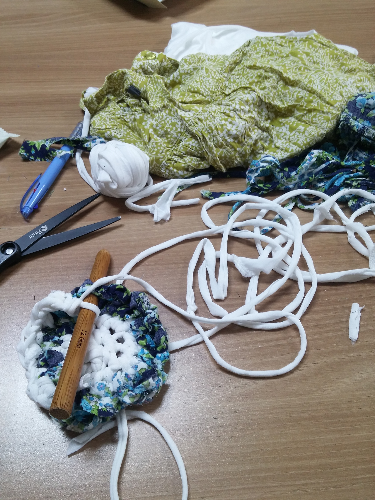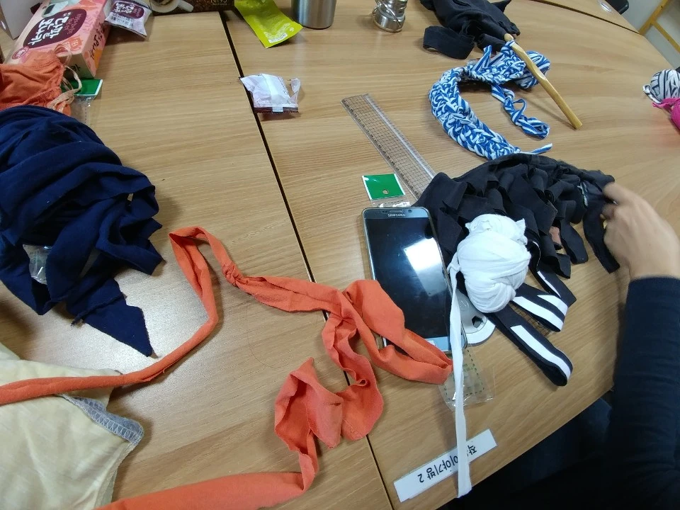 티셔츠를 실로 만드는 법을 배우고 열심히 작업중