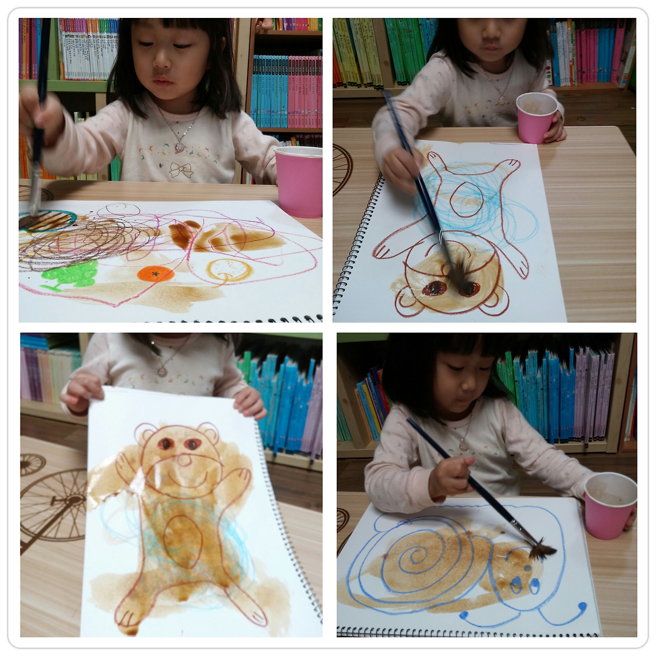 커피에 물을 조금 넣어진한 갈색으로 만들고 아이와 스케치북에 자유롭게 그림을 그린다