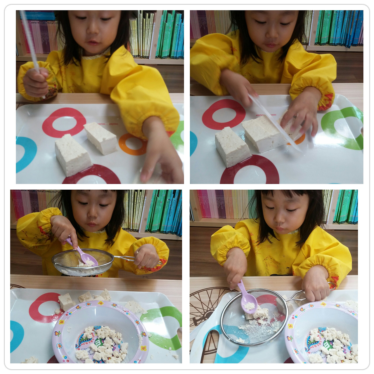 플라스틱 칼로 잘라보고 숟가락으로 으깨보고 체에도 넣어 보았다