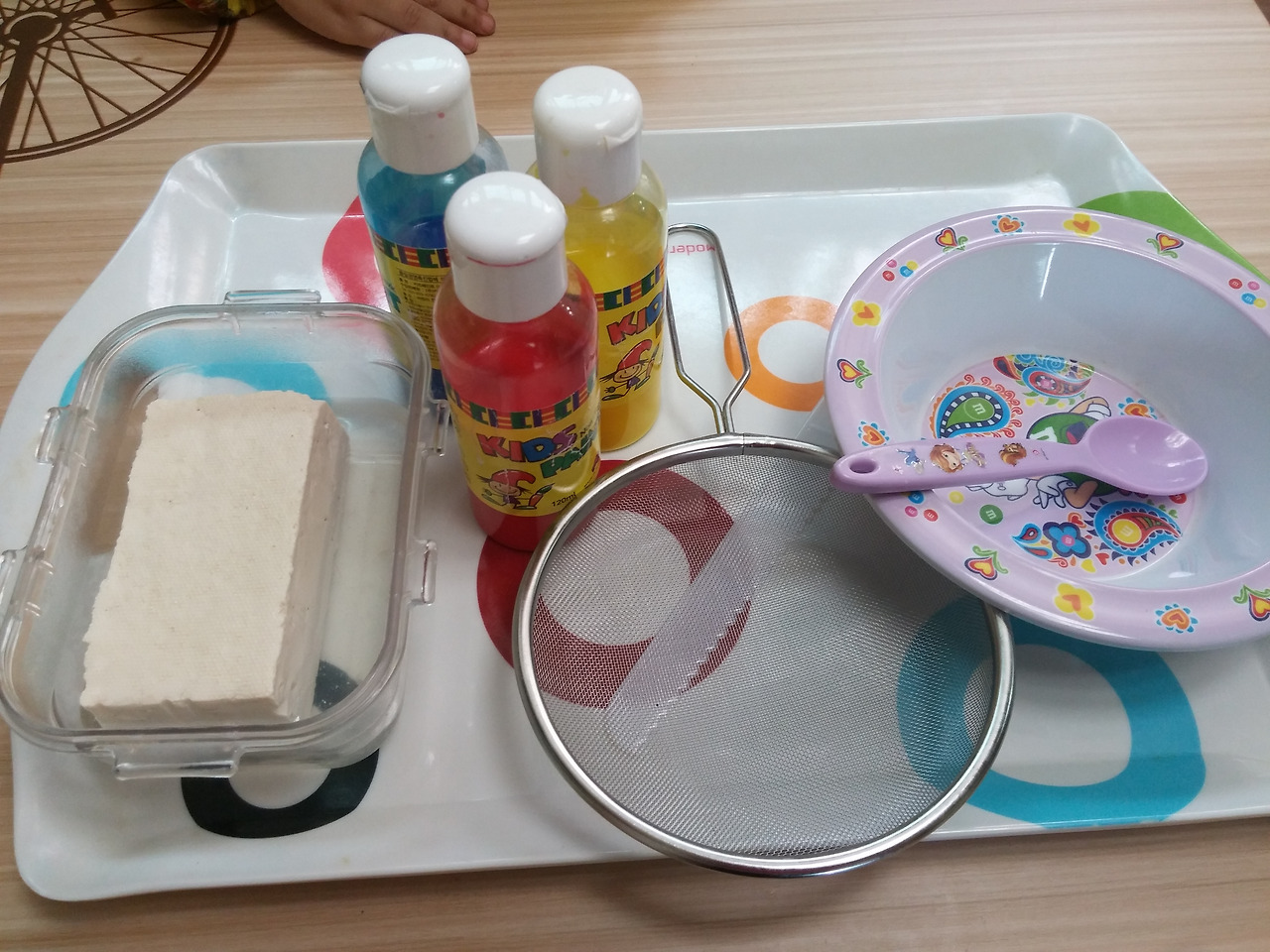 어느정도 으깬 두부를 손으로도 만져보고 물감을 섞어서 색깔두부를 만들었다