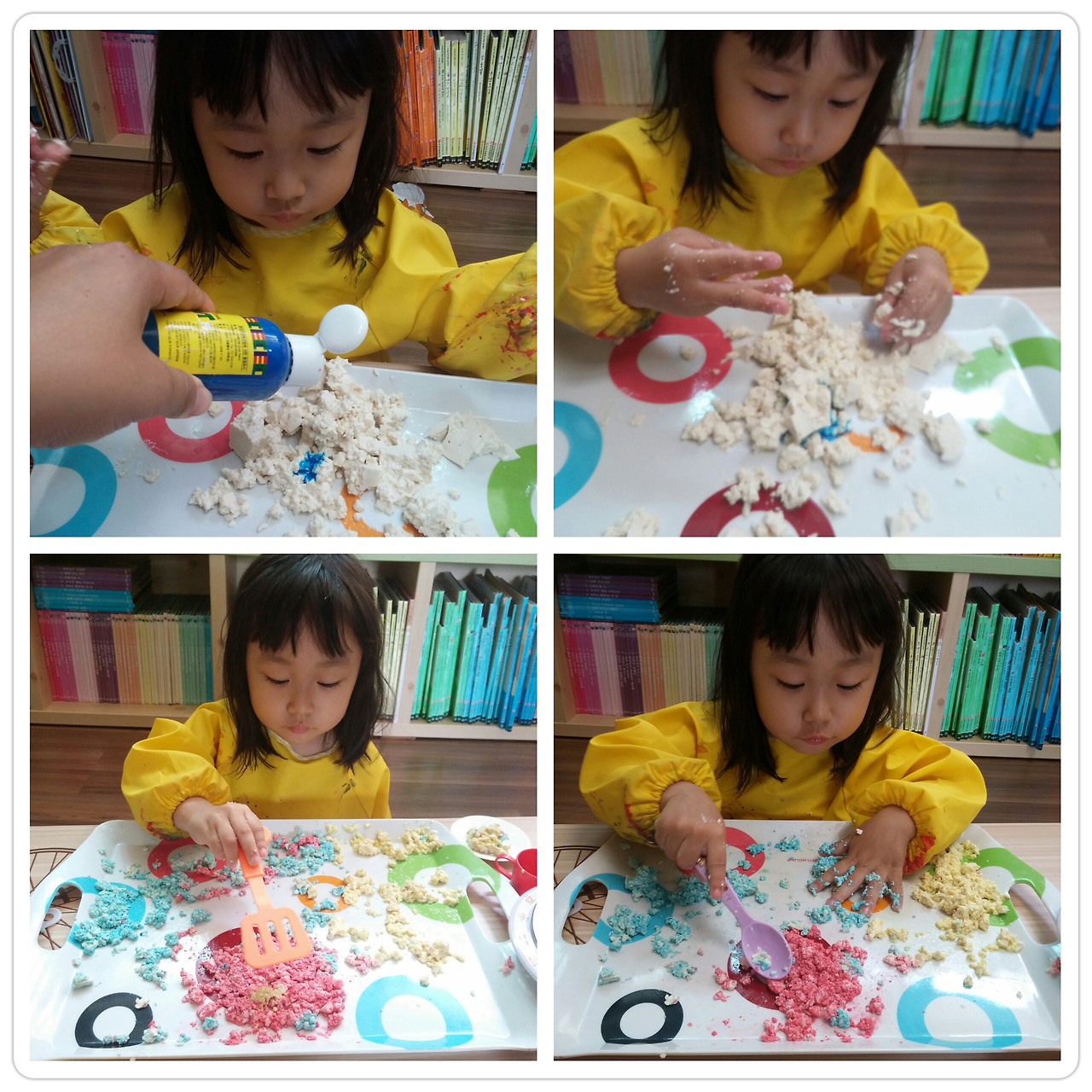 자연스럽게 부드럽다.말랑거린다.으깨진다라는것을 인지하고 표현하며 아이는 놀이를 진행했다