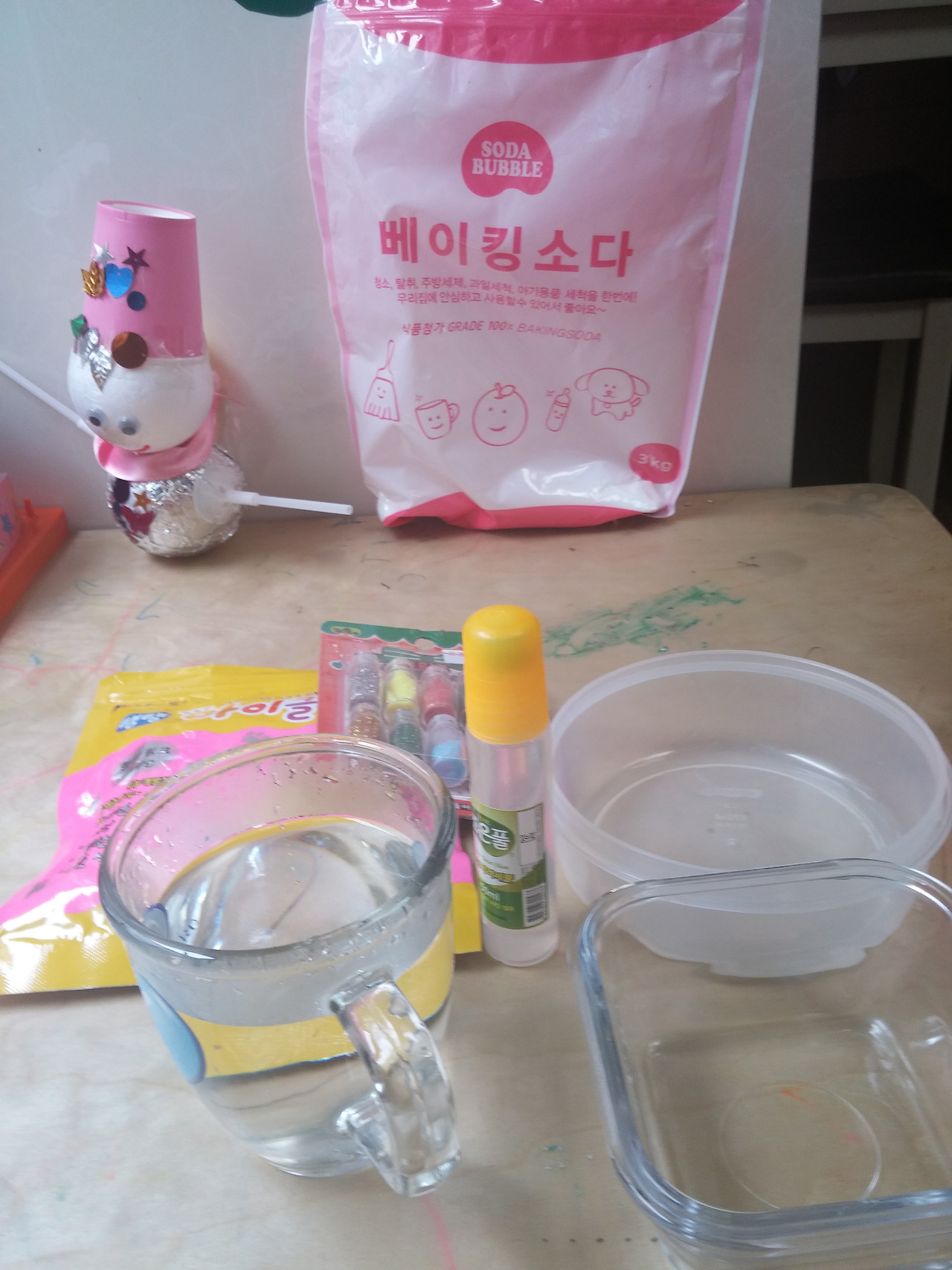 준비물은 그릇.뜨거운물.아이클레이.숟가락.물풀.소다.체