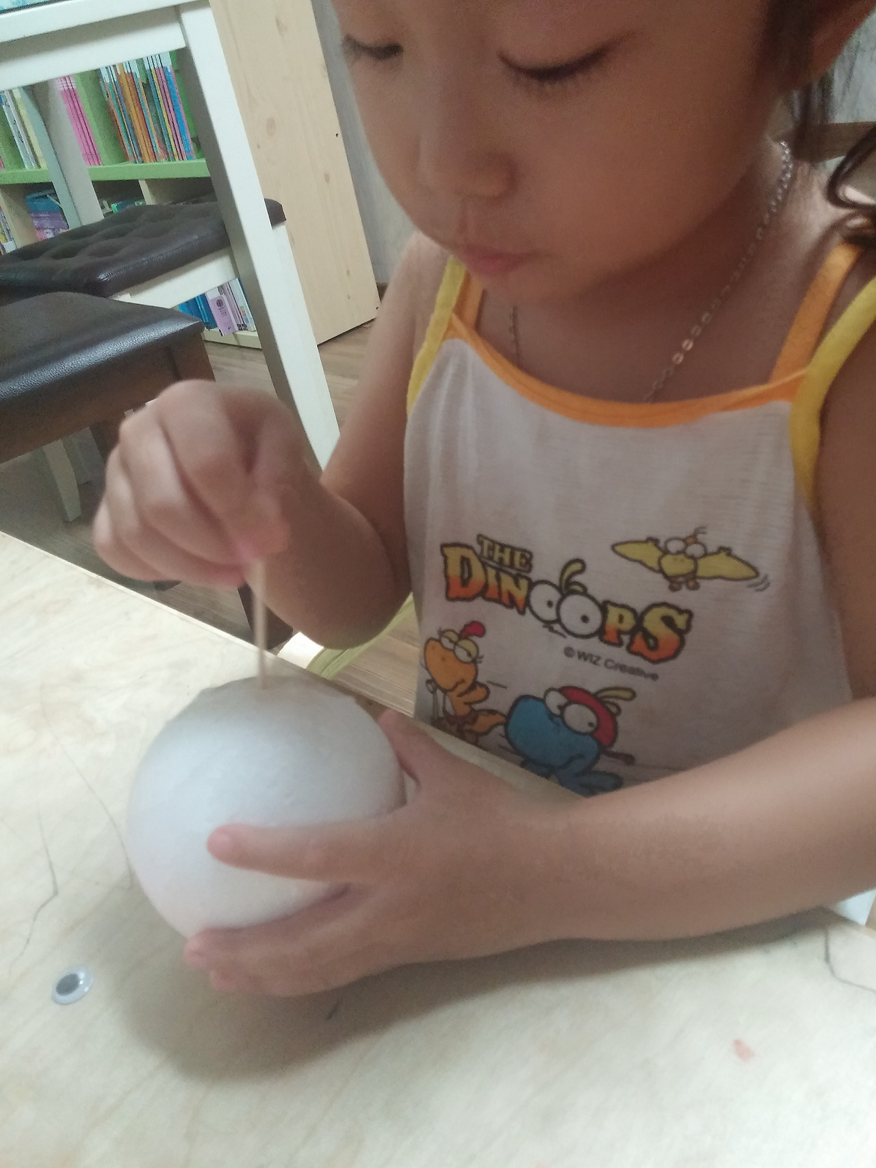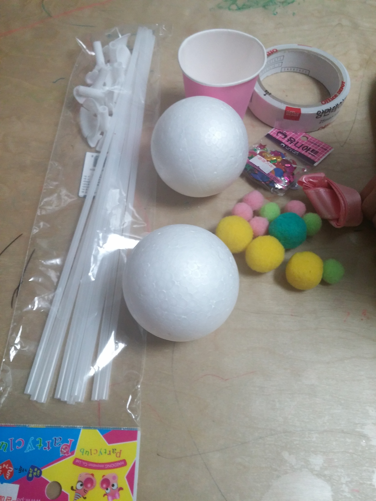준비물은 스트로폼 구 2개 (문구점에서 900원에구입) 풍선빨대와 받침대.꾸미기재료.테이프.눈알 2개